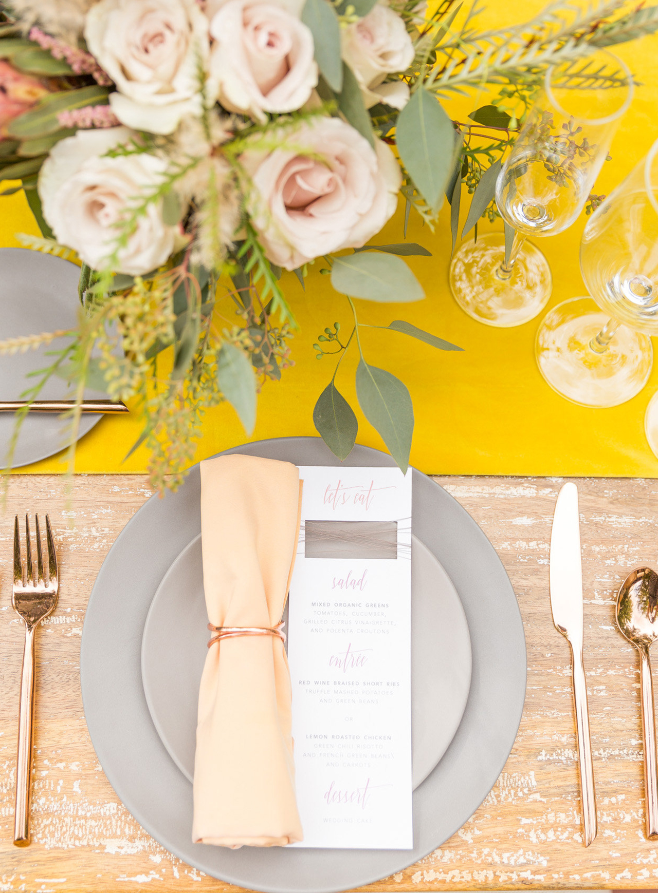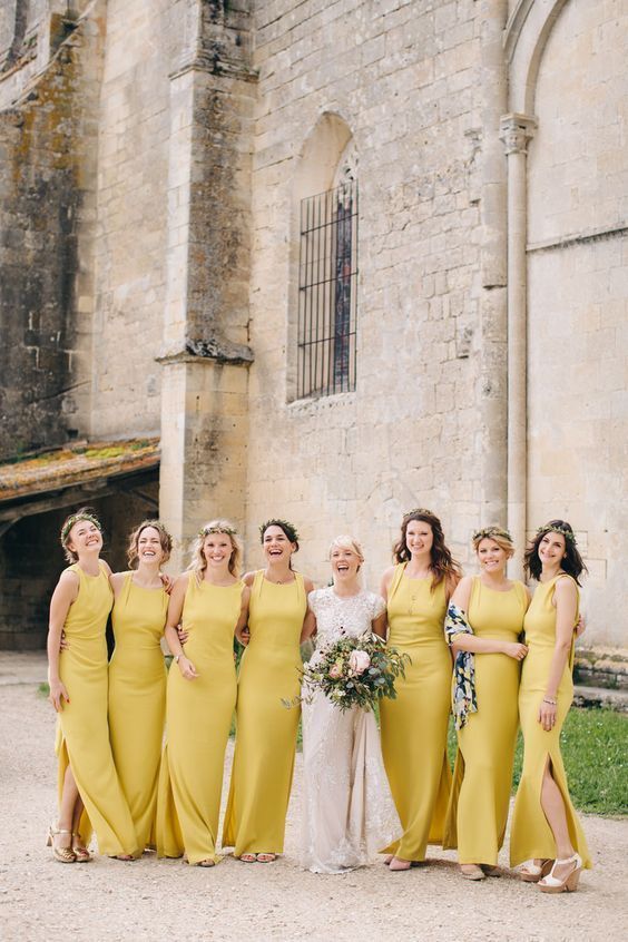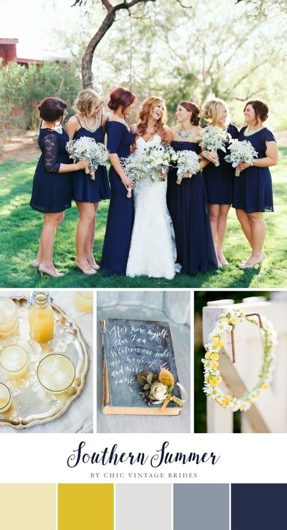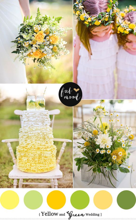 O que vai deixar esta combinação atual é usar as duas cores em elementos diferentes, e abusar das nuances de cada um para complementar o todo. Quer algumas ideias? Elementos de arquitetura como concreto, vigas, metais, os prateados em geral serão o fundo para sofás, almofadas ou toalhas em tons de amarelo, assim como limões sicilianos e flores (mimosas, tulipas, rosas, astromélias, lírios, gérberas, cravos, etc.) serão usados para compor a decoração. O vestido branco da noiva pode ser complementado com um lindo buquê de noiva em tons amarelos, ocre, mostarda e alaranjados combinando com o terno cinza claro do noivo. Abuse dos metálicos também, eles continuam atuais- pense nos vestidos de noiva com glitter, objetos de decoração em prata e talheres! Ahhh, o verde das folhagens complementa este duo de forma bastante elegante.