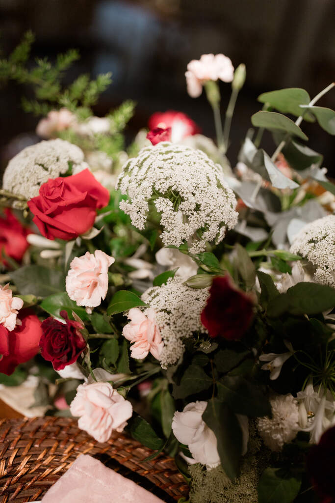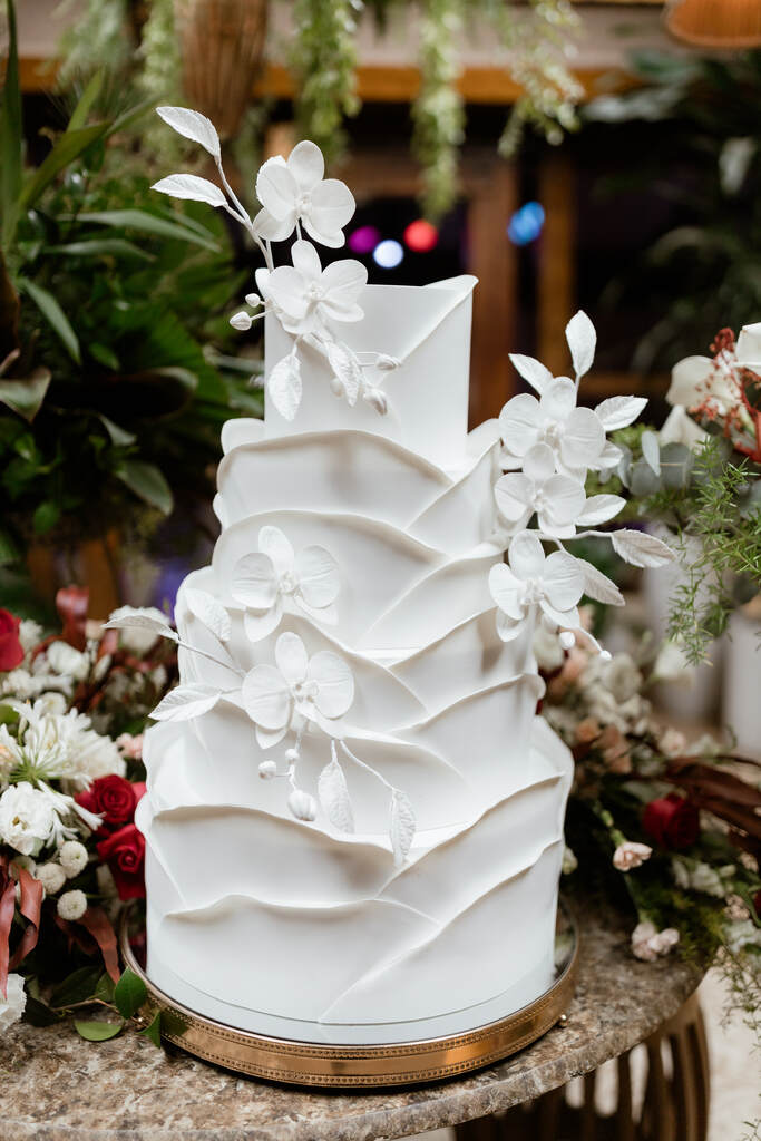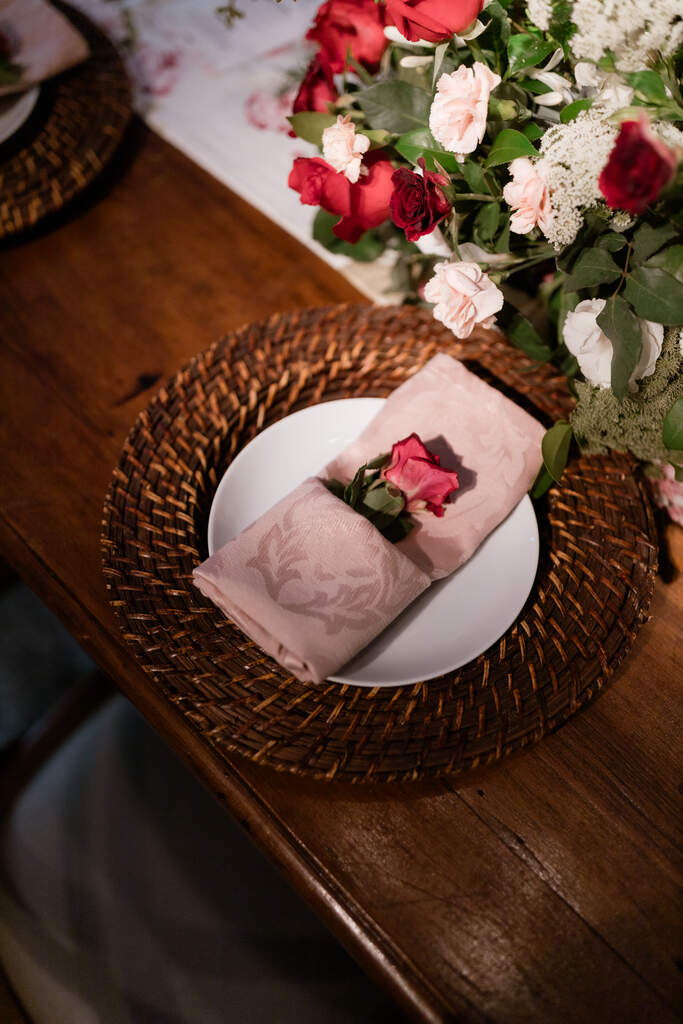 A decoração, assinada pelo Buffet Capricho, trouxe um clima super romântico, com uma paleta de cores em tons de verde, branco, bege e vermelho escuro.
