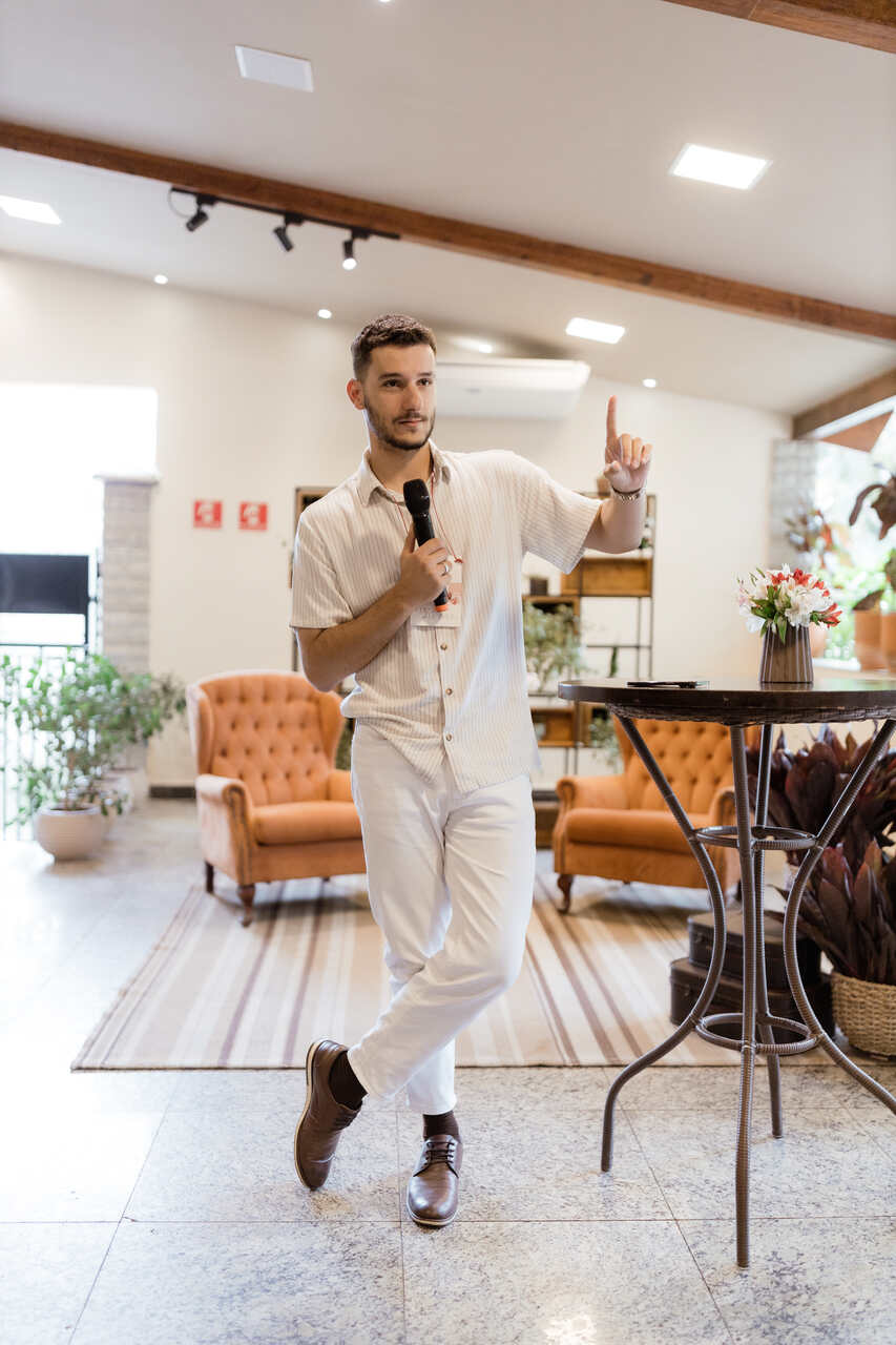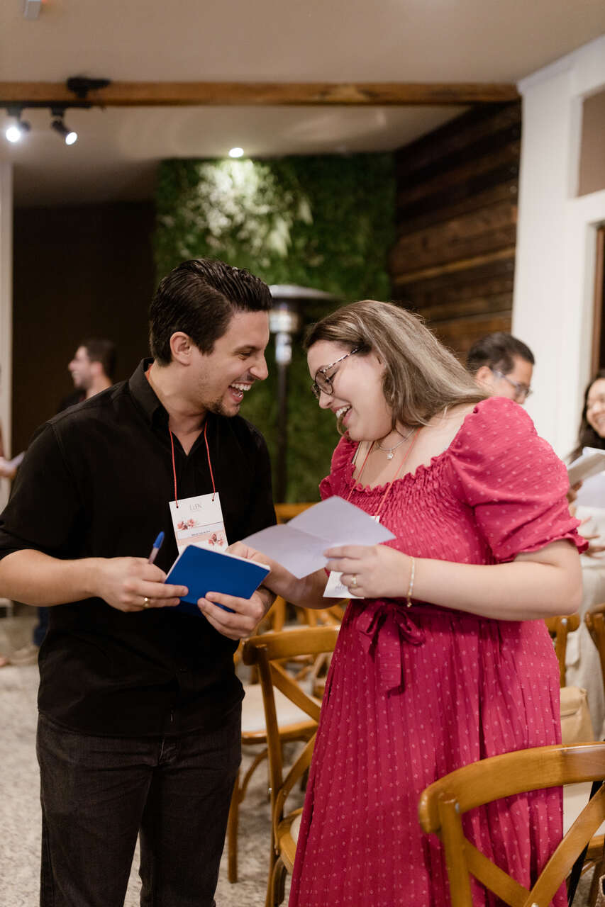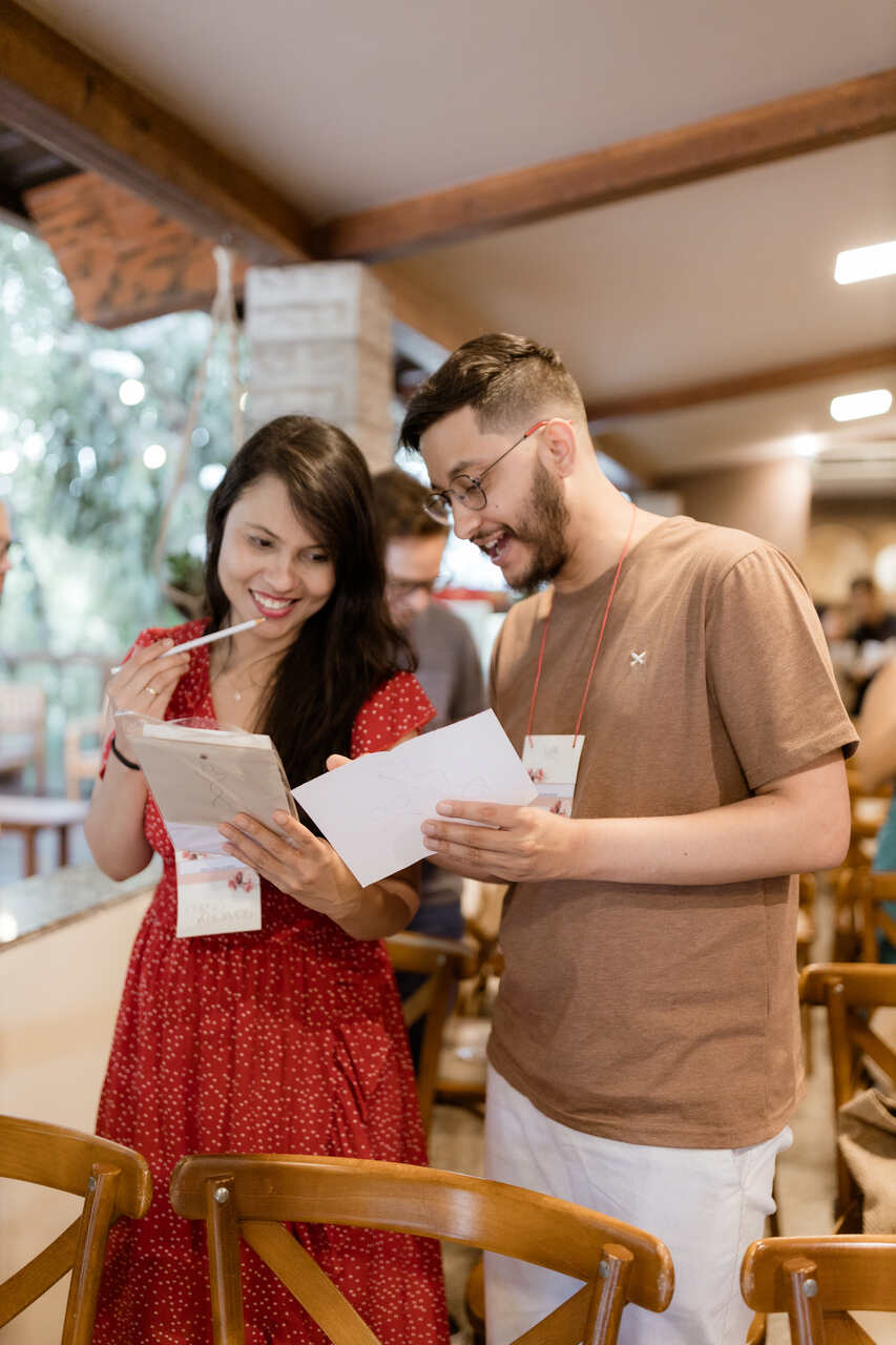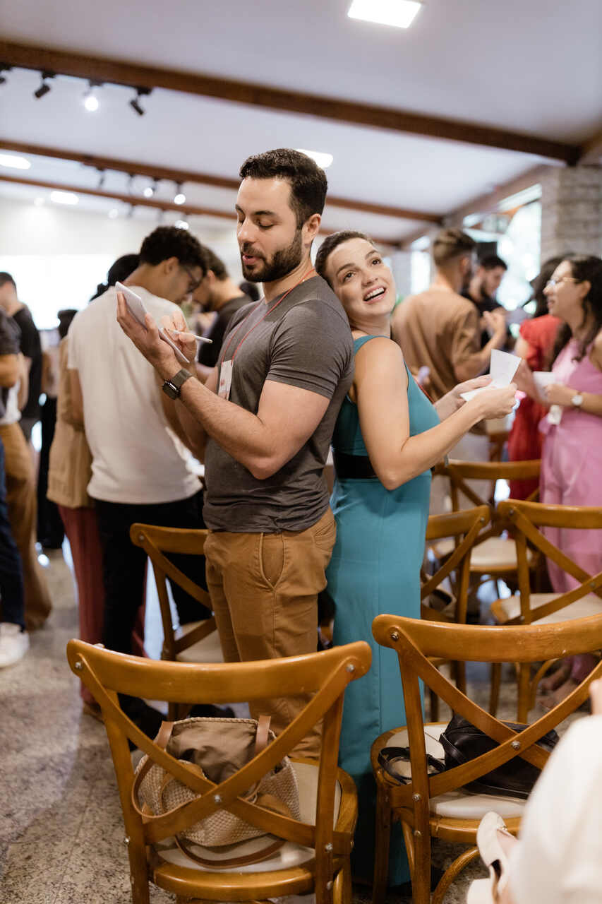Pra fechar, os noivos participaram de uma dinâmica divertida que destacou, de forma leve e prática, a importância de manter uma comunicação aberta e sincera no dia a dia.