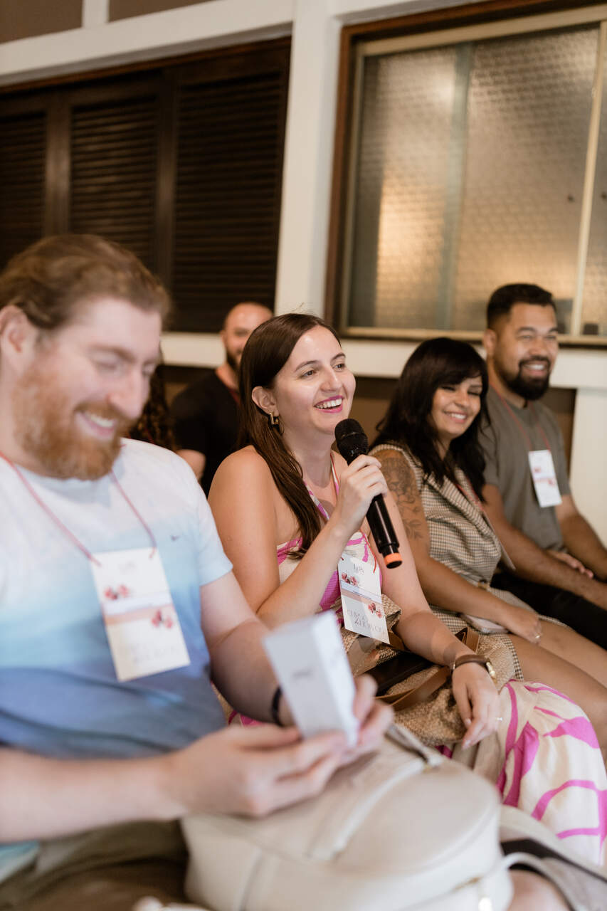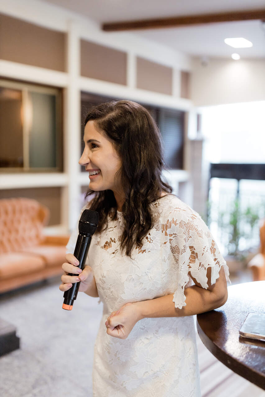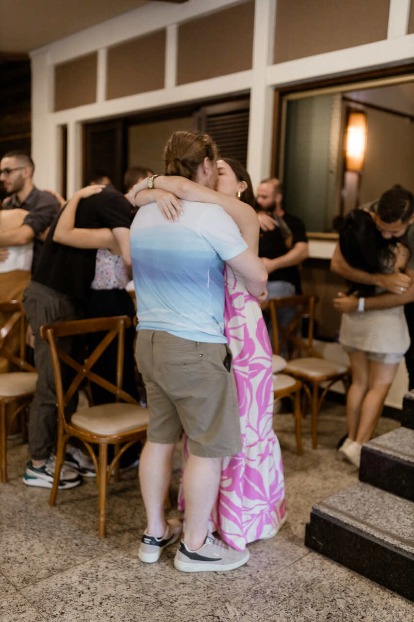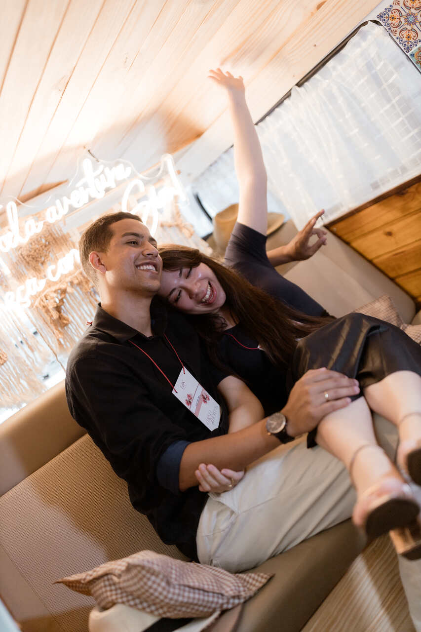 Pra fechar, os noivos participaram de uma dinâmica divertida que destacou, de forma leve e prática, a importância de manter uma comunicação aberta e sincera no dia a dia.
