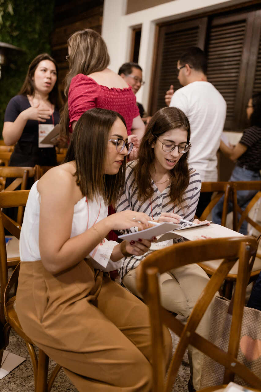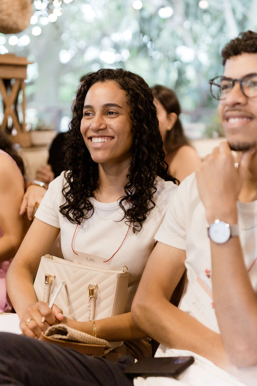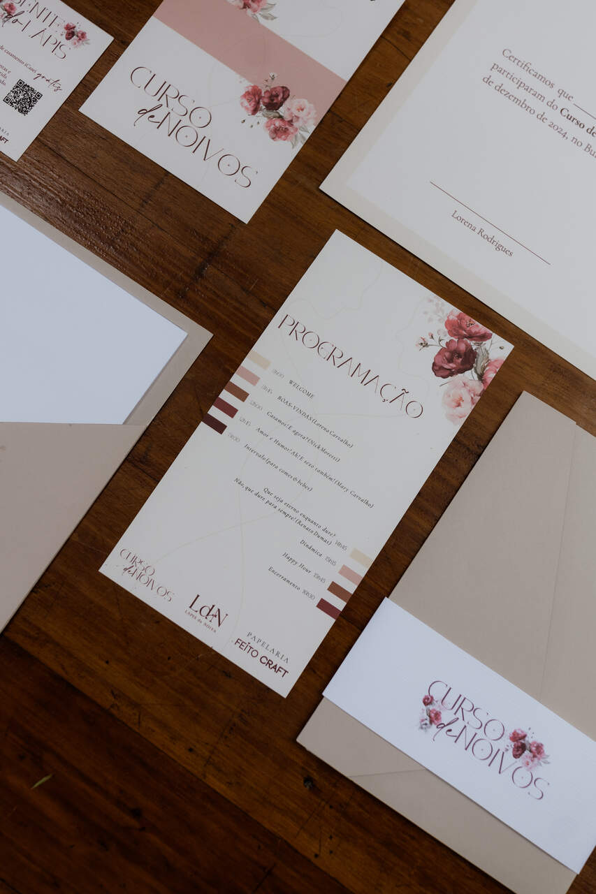Nossa papelaria foi criada pela talentosa Feito Craft, com uma identidade visual exclusiva para o curso. Os detalhes personalizados incluíram crachás, programação, certificados de conclusão e até bloquinhos super fofos pra anotar todas as dicas dos palestrantes.