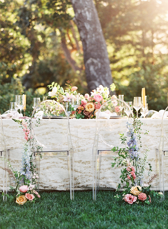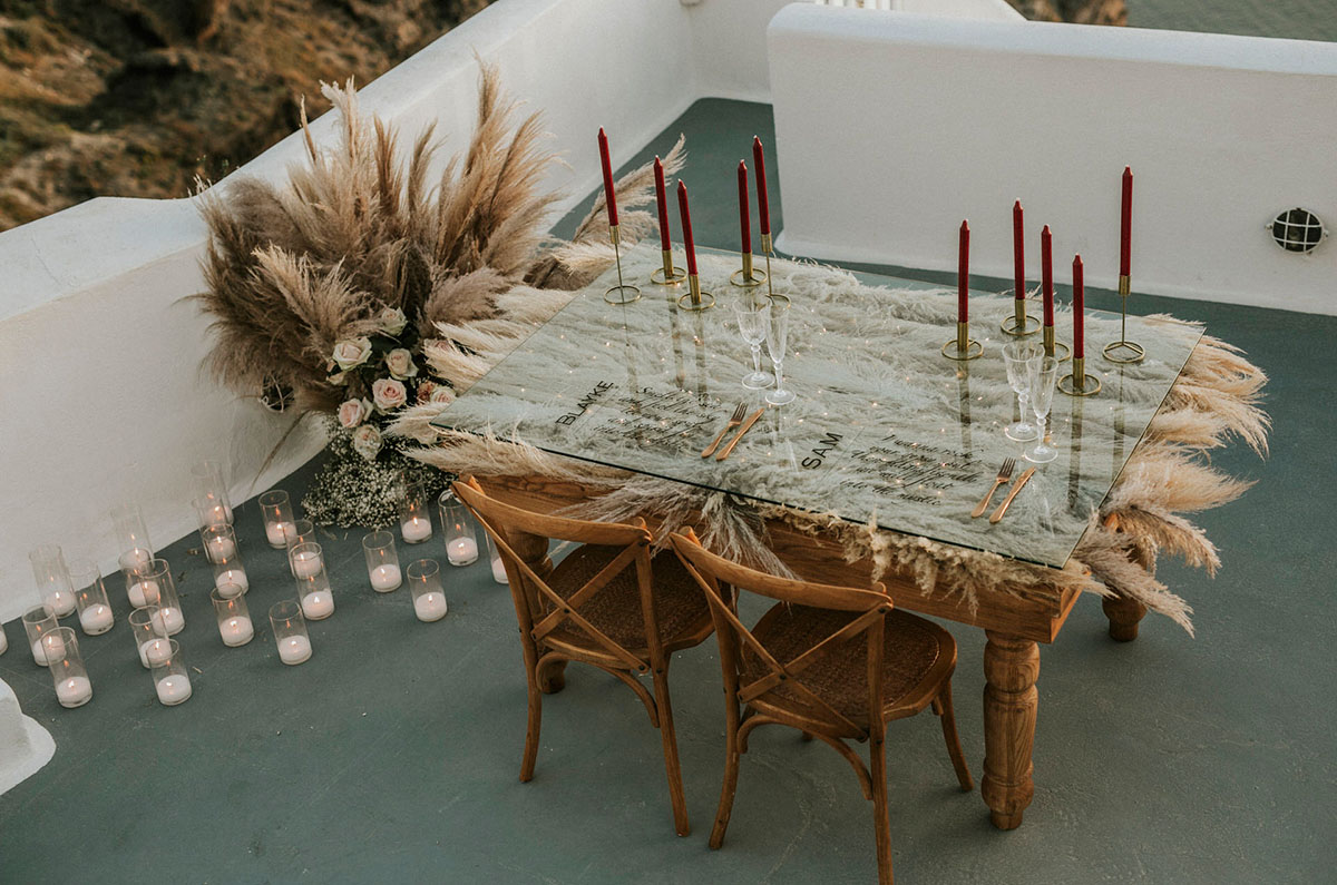 Combine itens de decoração de casamento em acrílico com a capim do pampas para suavizar as estética boho, inclusive com o uso de flores e folhagens secas. Ainda, o acrílico pode ser tingido ou pintado para personalizá-lo e deixar a decoração com a carinha dos noivos.