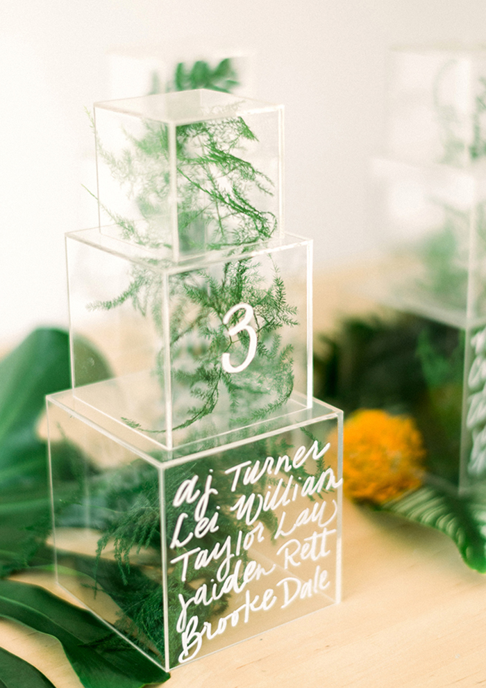 Os materiais também são fáceis de cortar e modificar, tornando-os excelentes telas para qualquer coisa que você sonhou. O acrílico é um material leve, moderno e muito adaptável, arrisque sem medo. No entanto, é melhor ser usado quando complementa, em vez de ofuscar outra parte da decoração, porque a verdadeira beleza do acrílico é que ele pode elevar um espaço sem desviar os olhos do resto do casamento.