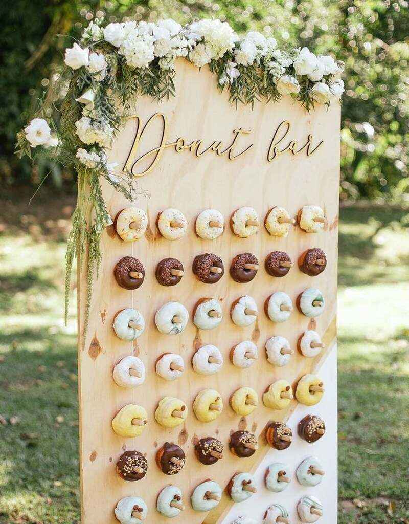 Uma forma bacana de decorar e ainda criar um espaço de interatividade com as convidadas é através de estações de doces. Aqui a criatividade não tem limites! Você pode fazer uma parede de donuts, um bar de pipocas gourmet ou outros quitutes deliciosos que vão surpreender todos os presentes.