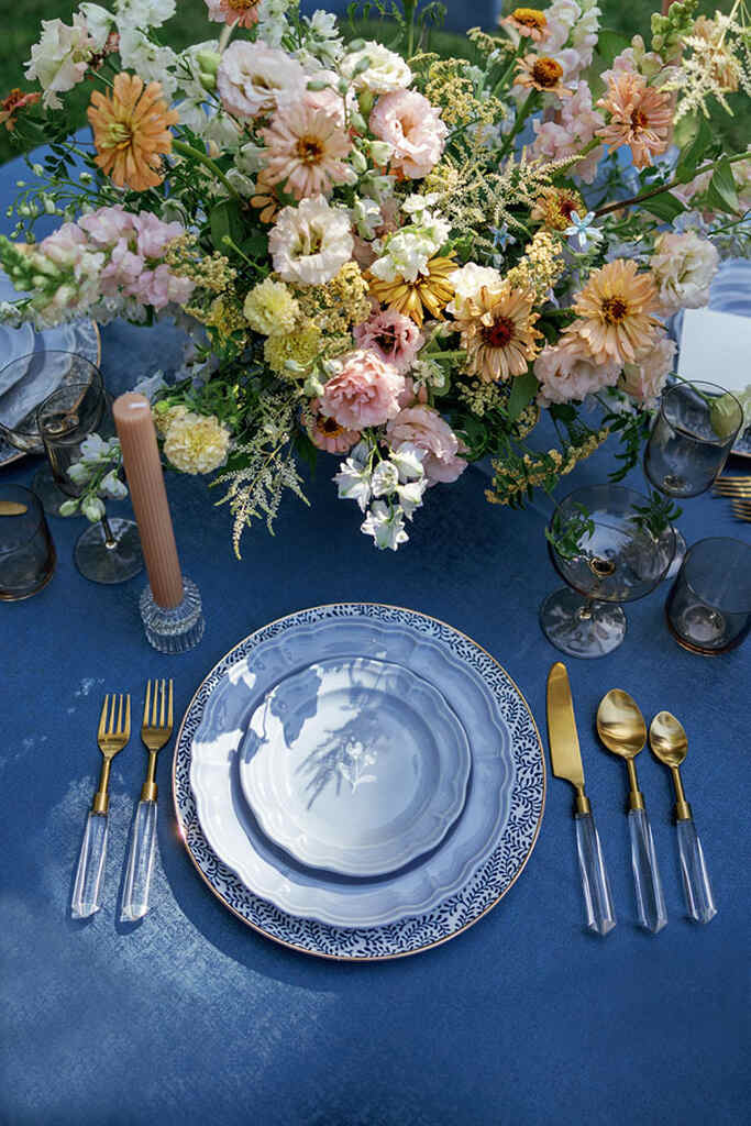 O estilo pede muitas flores delicadas, geralmente na cor rosa, azul e lavanda. Além disso, invista em detalhes com texturas, adornos e estampas florais como pratos, taças clássicas e bandejas para os doces.