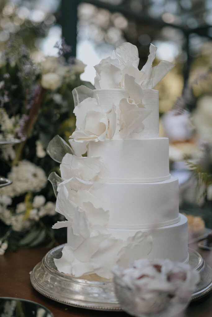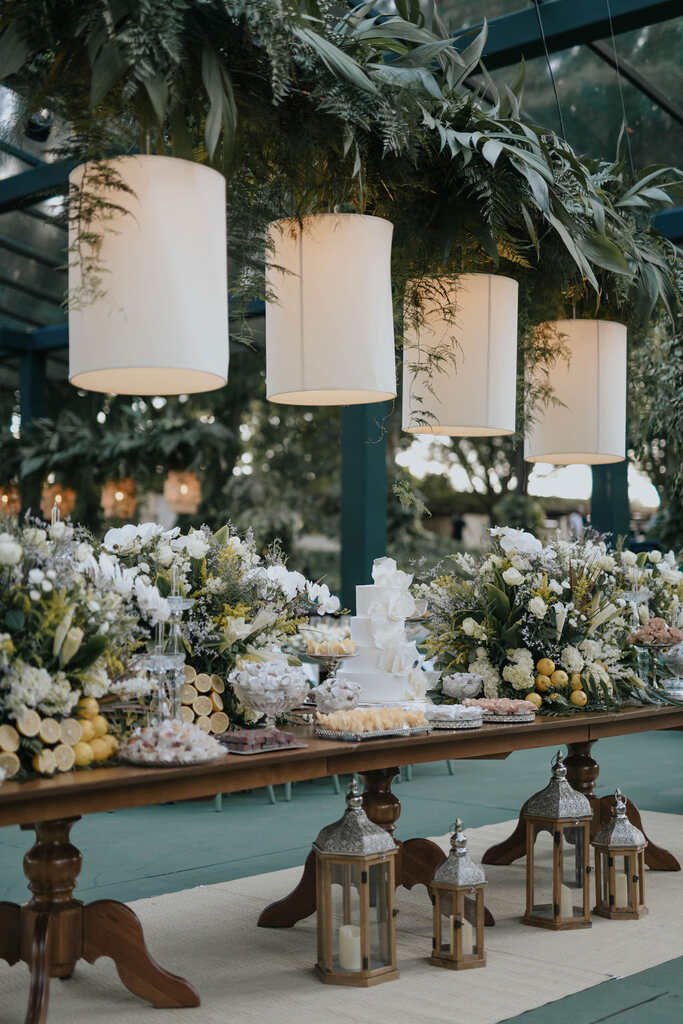 mesa do bolo decorada com flore sbrancas e limão siciliano