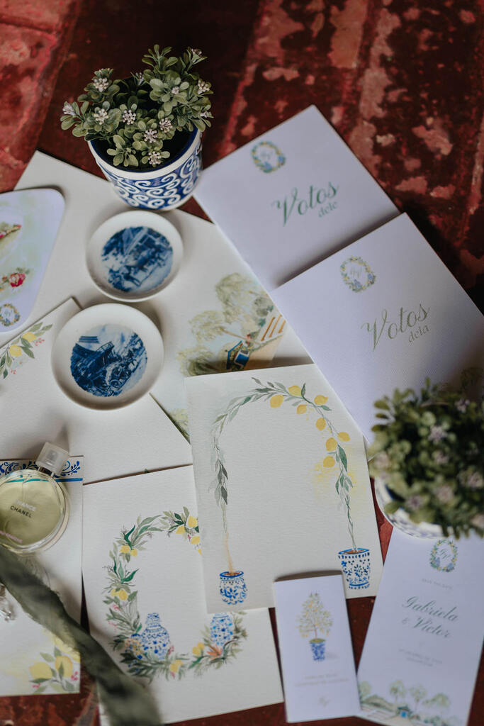 Enquanto os elementos mais “clássicos” como os vasos, arabescos e o azul intenso ficaram para os convites.