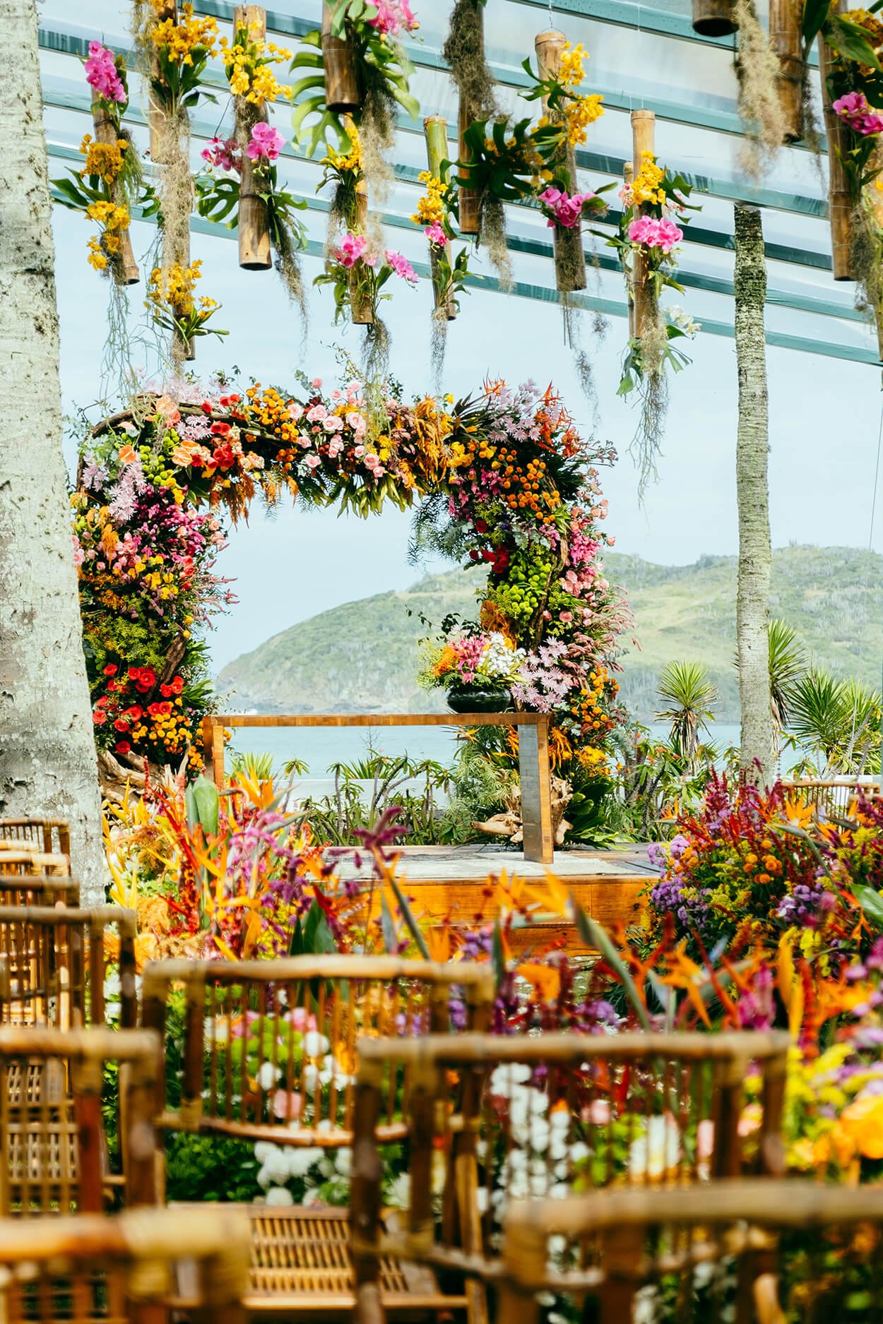 Em todo casamento as flores são um elemento importante, mas nos enlaces tropicais isso fica ainda mais evidente. E seria impossível não comentar sobre a mesa em torno dessa árvore. Nós adoramos a vibe relax e o mix com cores neutras. Mas, gente, nós amamos as luminárias e os arranjos pendentes com bambus…Uau!
