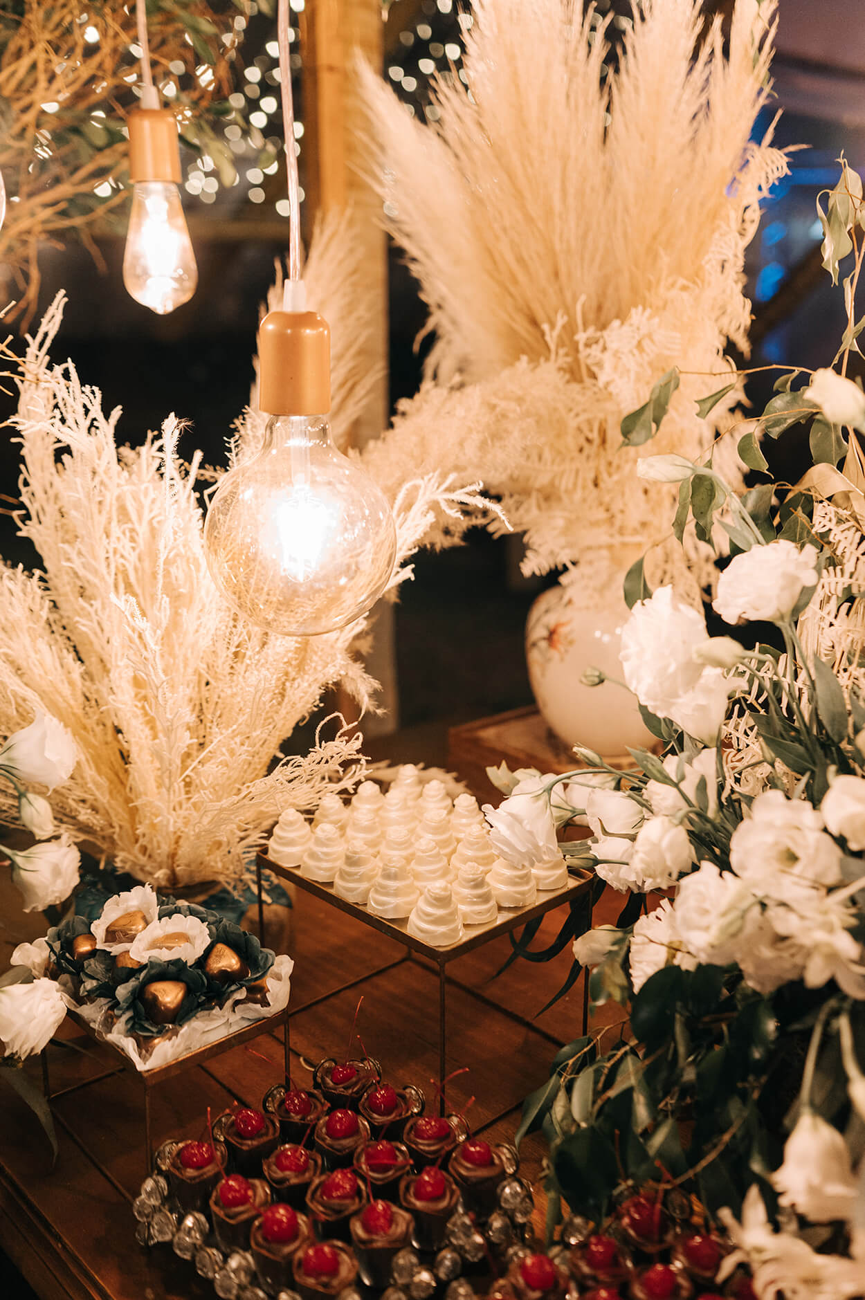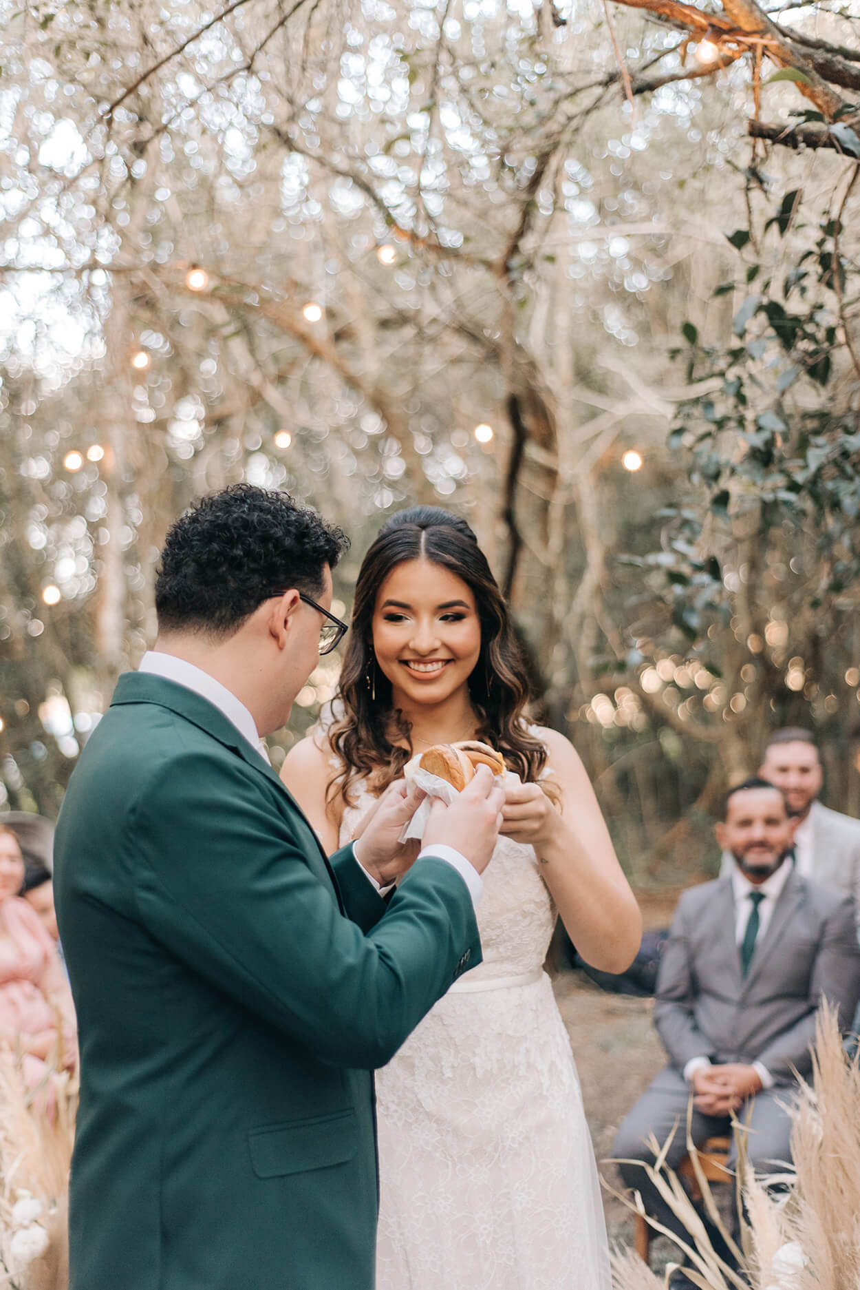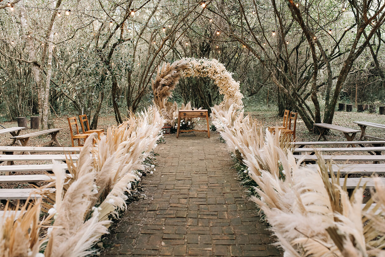 “Desde o começo queríamos que a cor principal fosse o verde pois é a cor preferia do Ricardo e os tons de palha, off white e bege entraram para complementar a cor principal”. E não tem como negar que o capim dos pampas deu um toque especial a cerimônia, não é?