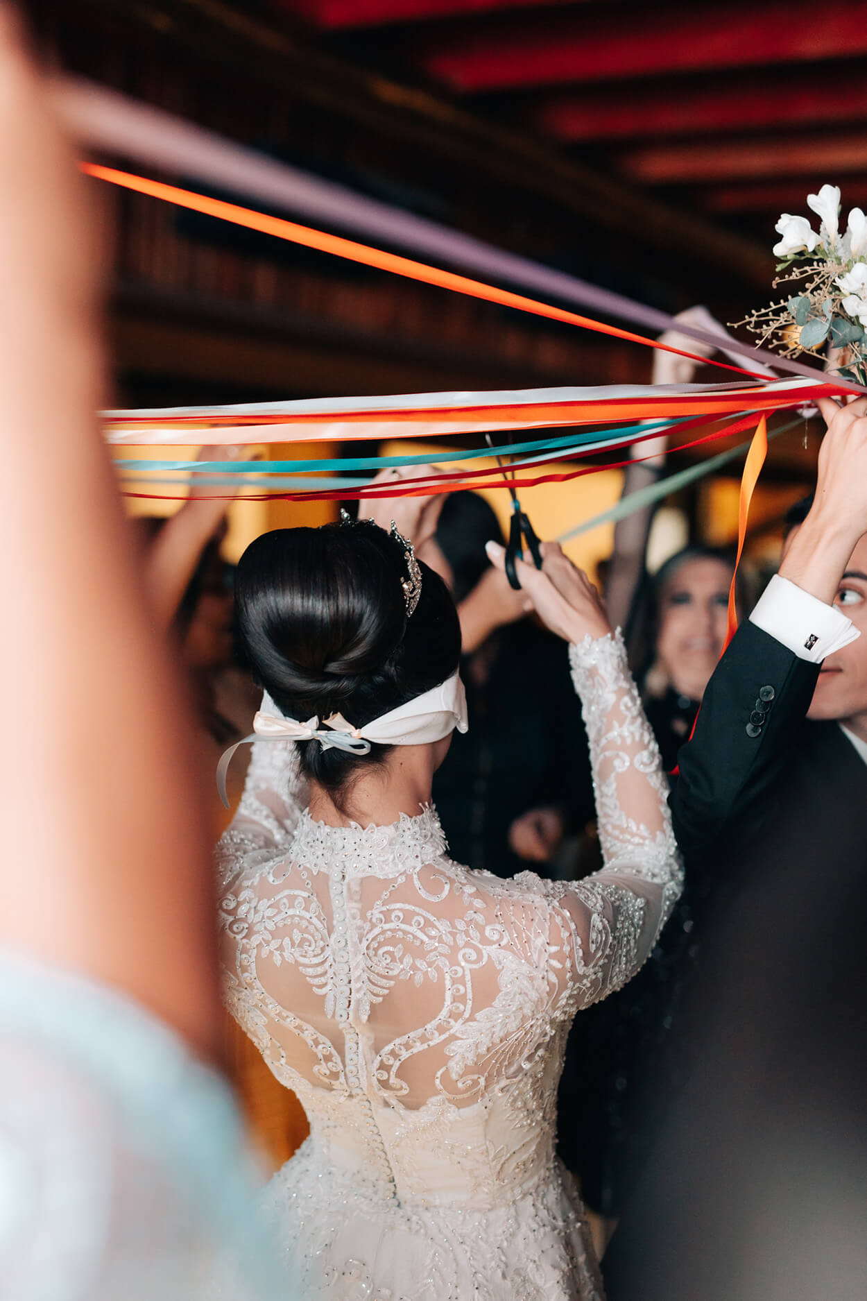 Aqui, a noiva foi vendada e saiu cortando as fitinhas de cada convidada solteira, até revelar quem seria a escolhida.