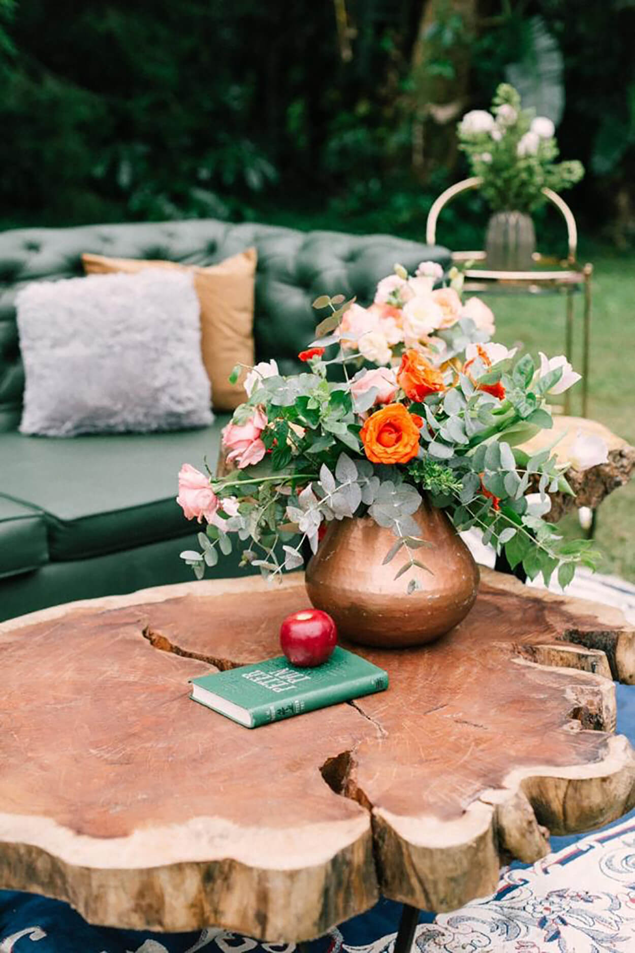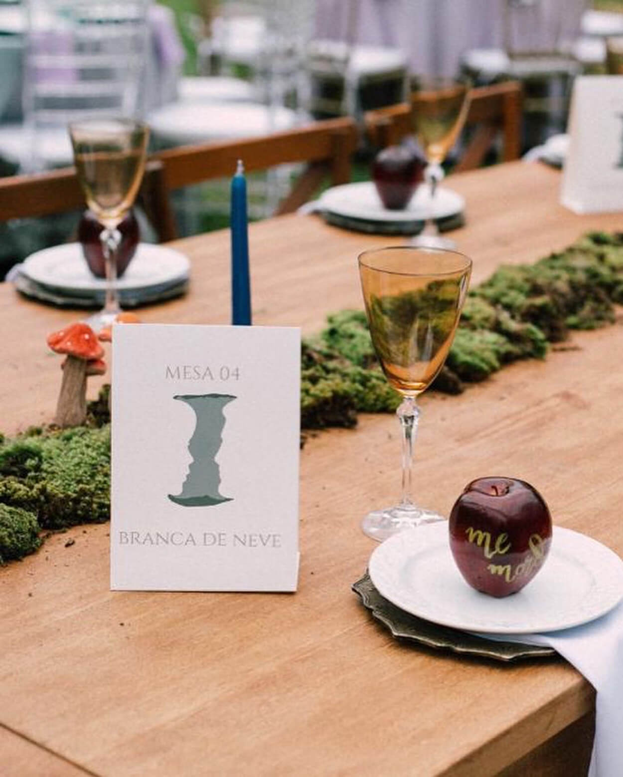 Cada uma das 8 mesas foi decorada de acordo com um filme clássico. Aposto que só de olhar rapidinho, você já sabe dizer qual é a mesa da Branca de Neve, não é? As cores, texturas e objetos aqui provam que é sim possível fazer um casamento temático cheio de referências e fora da caixinha.