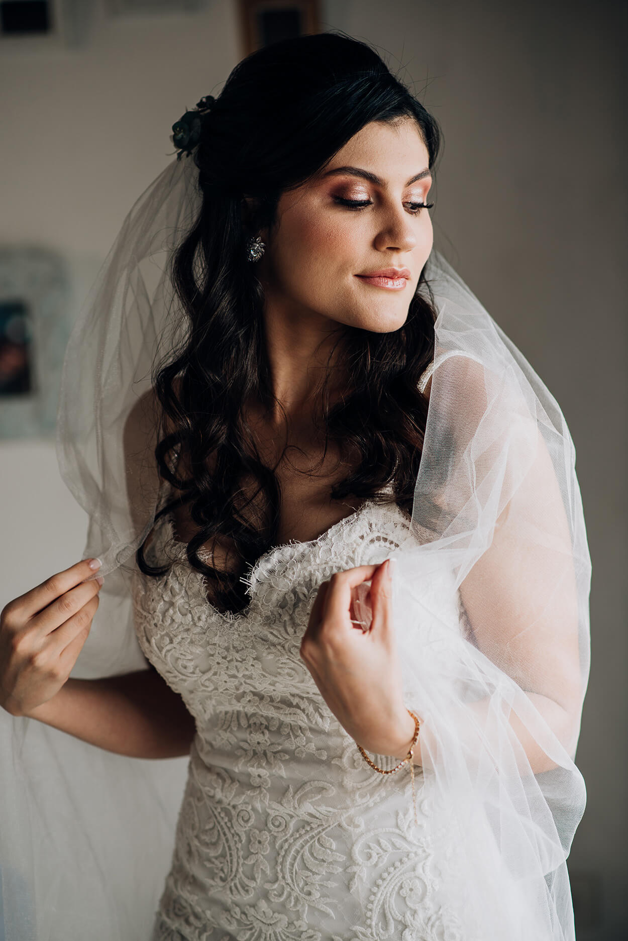 Ayla escolheu um vestido bem elaborado, todo produzindo com bordados e finalizado com um belo decote. Se você ainda não escolheu um penteado, dá uma olhada nesse feito na noiva, além de lindo é funcional.