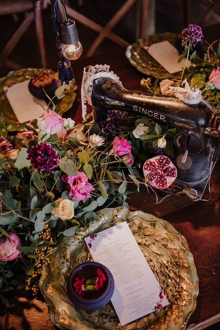 “Como sou uma pessoa que gosta muito de referências gypsy e vintage, procurei seguir este estilo de decoração.” Vários detalhes compuseram a decoração e trouxeram a atmosfera gypsy tão sonhada: luminárias, tapetes, plantas suspensas, ferragens vintage, arranjos, mobiliário, macramês, guirlandas pelo caminho até a festa. Usaram vários artigos vintage de decoração que pertencem à mãe da noiva. O ponto alto da decoração para ela foi o backdrop de tapetes persa que ficava atrás da mesa do bolo. Houve o cuidado especial de criar um cantinho para fotos super lindo. A paleta de cores era em tons azul e cobre.