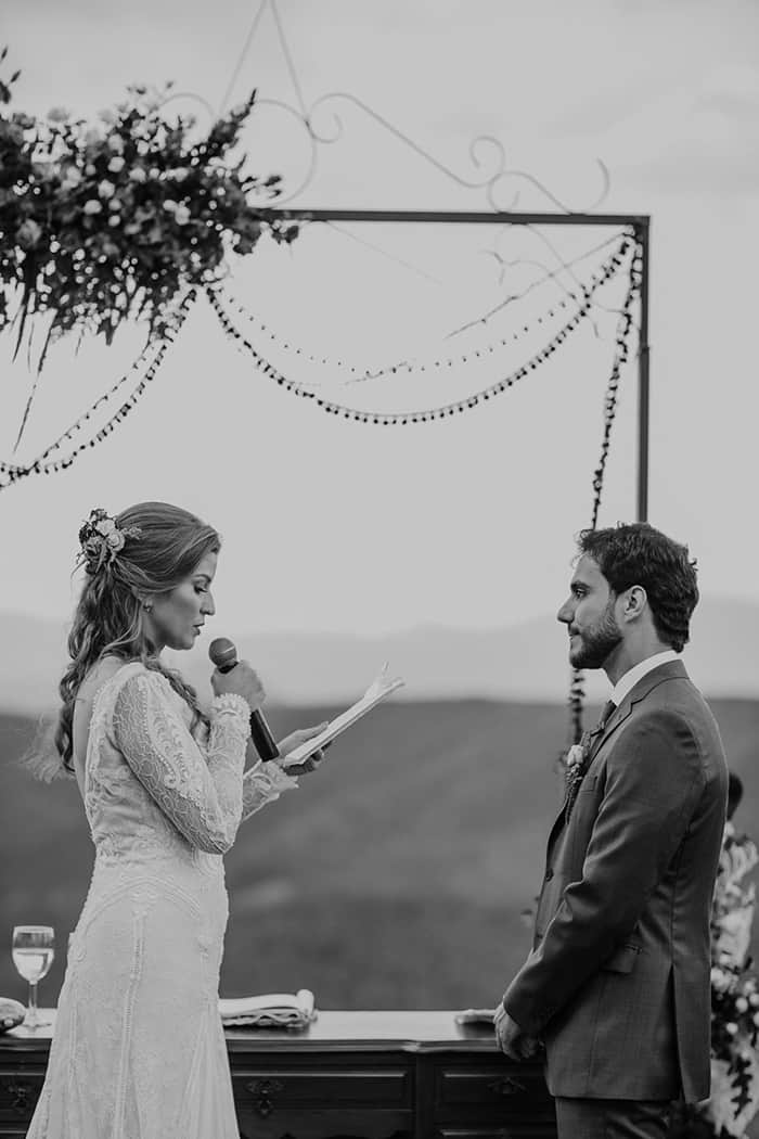 A celebração e os votos foram emocionantes. A celebrante soube ler o relacionamento de uma maneira leve e delicada, como se fosse uma poesia. Foi lindo ouvir a história por ela, e ver o quanto os dois já tem uma história linda a contar. Os noivos e muitas pessoas se emocionaram com a belas palavras dela.