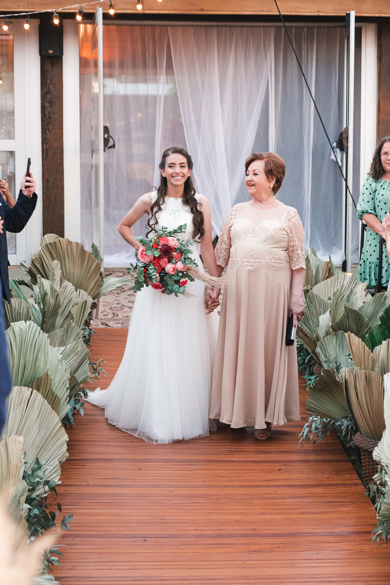 Esse dia foi celebrado com muito amor e alegria, e claro, que teve aqueles momentos que ficam na memória como a entrada das “daminhas”, que no caso, foram as cachorras de um casal de padrinhos. “Elas sempre foram presentes em nossas vidas, e consideramos elas como nossas também! Além, é claro, da entrada da aliança ter sido feita pelo nosso próprio filho de quatro patas, o Ted!”. Muito fofo!