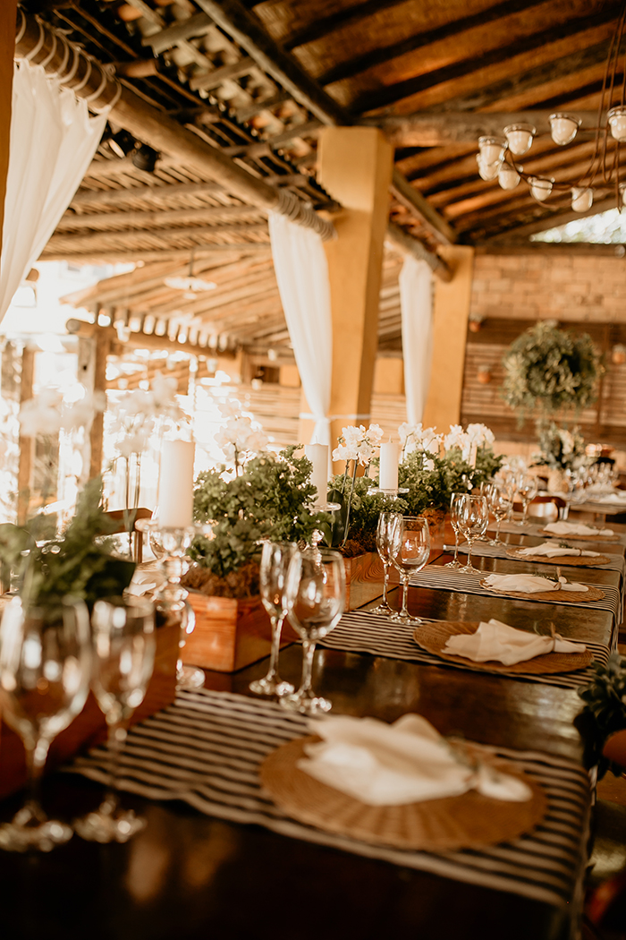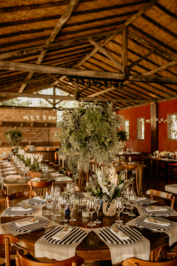 A decoração girou em torno de flores e folhagens branco e verde, com itens em tons azuis também, num estilo navy.