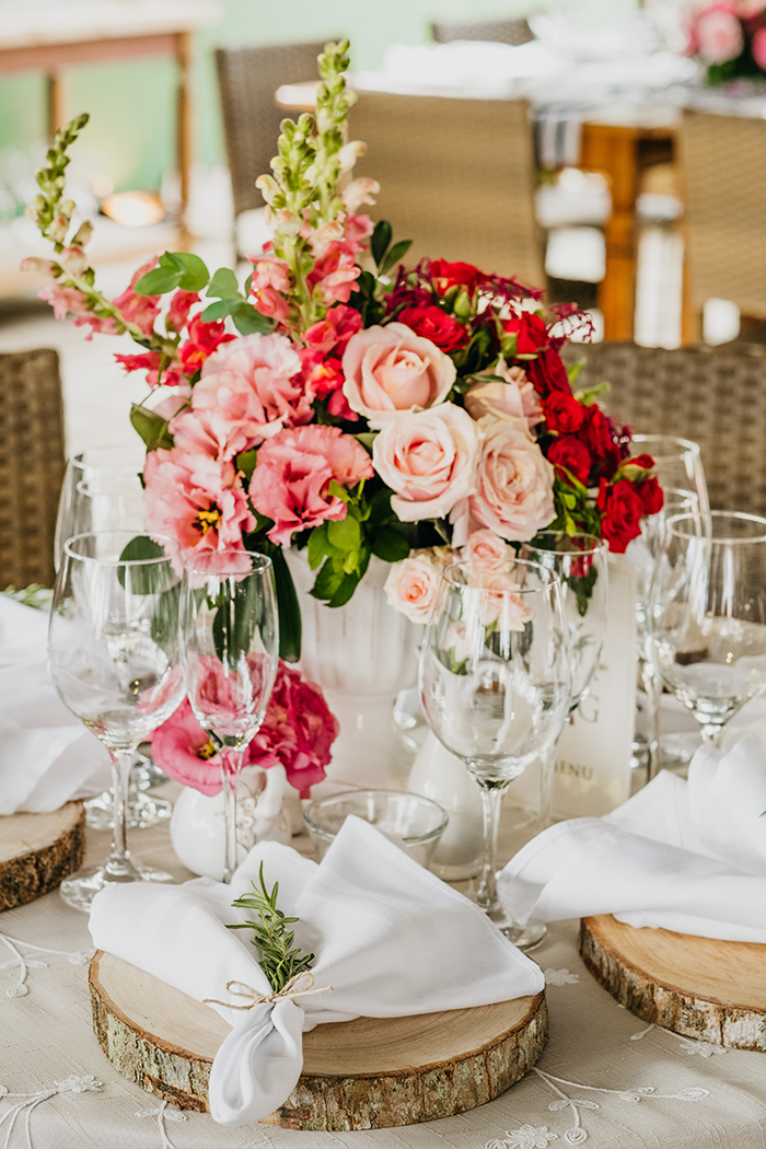 Apesar do tema rústico da praia, incluíram nas cores algo que lembrava o estilo tradicional, como flores em vários tons de rosa e louças de azulejo português.