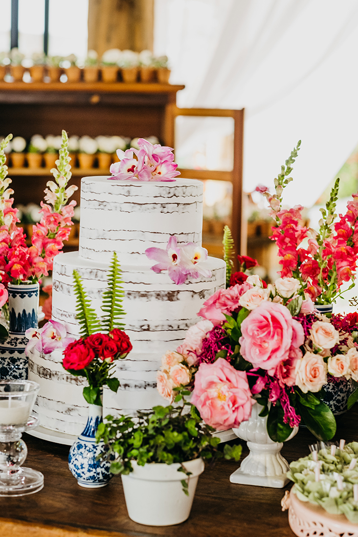 A minha segunda dica é específica para quem quer casar ao ar livre: esteja preparada pra tudo! Não idealize um dia perfeito, porque não temos controle sobre o tempo. Já encontrei muitas noivas sofrendo por antecipação com medo da chuva — eu sempre dizia para todo mundo: NÃO VAI CHOVER NO SEU CASAMENTO! Eu acreditava piamente nisso, proclamava aos quatro cantos e, realmente, não choveu! Então, apenas confie, entregue e agradeça… e mesmo que se caia um mundo de chuva, o seu casamento vai ser perfeito! Se for o sonho da noiva casar ao ar livre, case!”