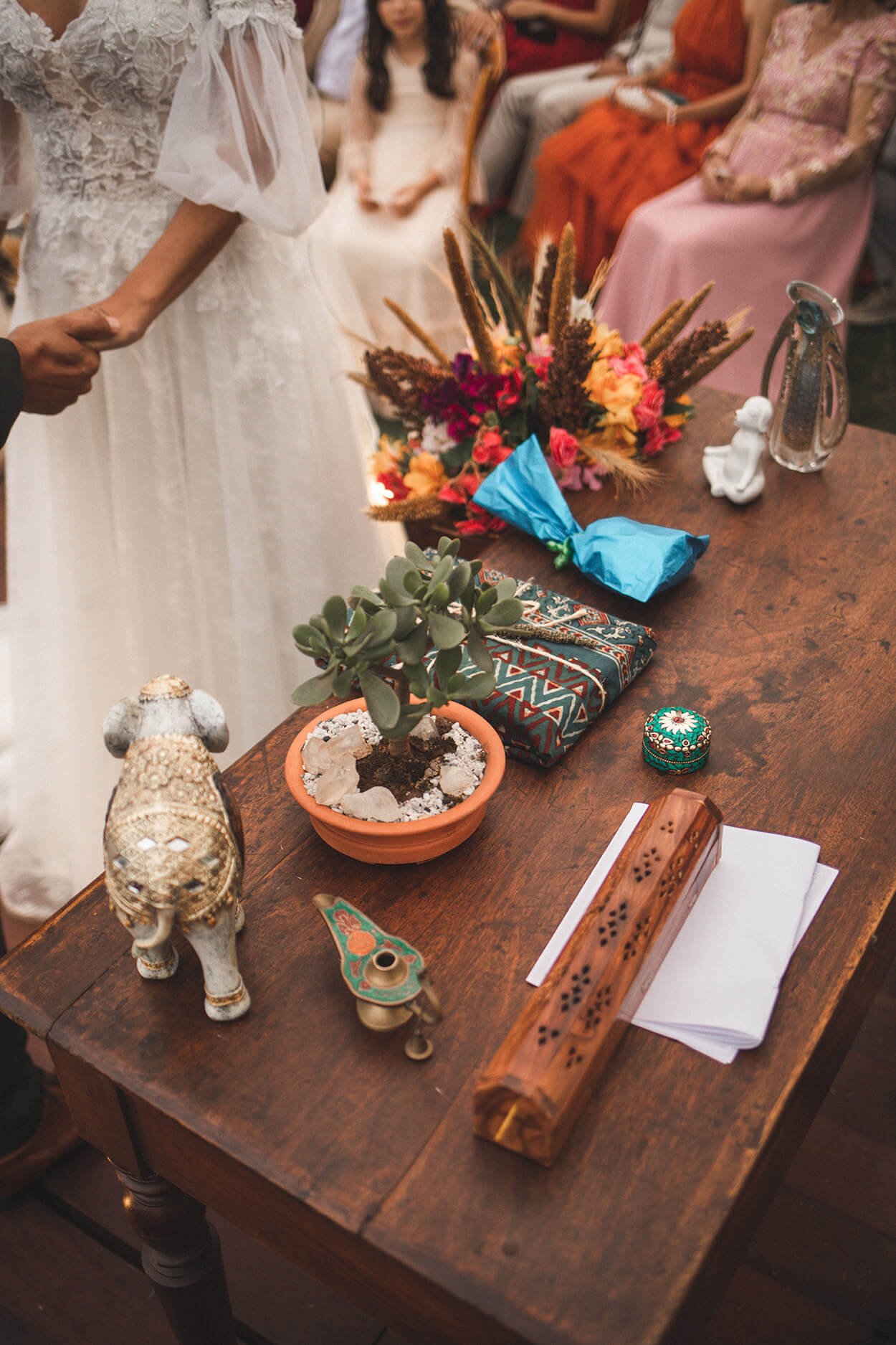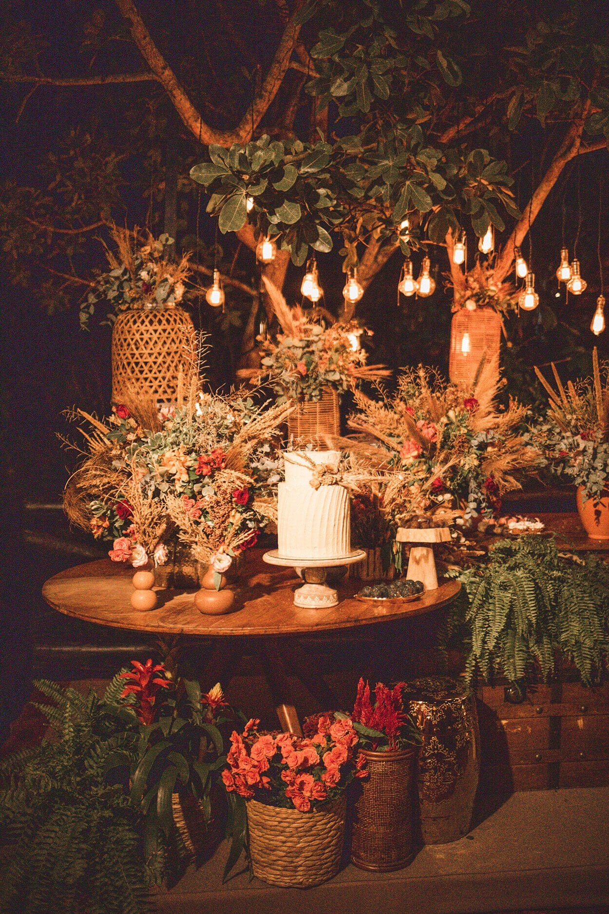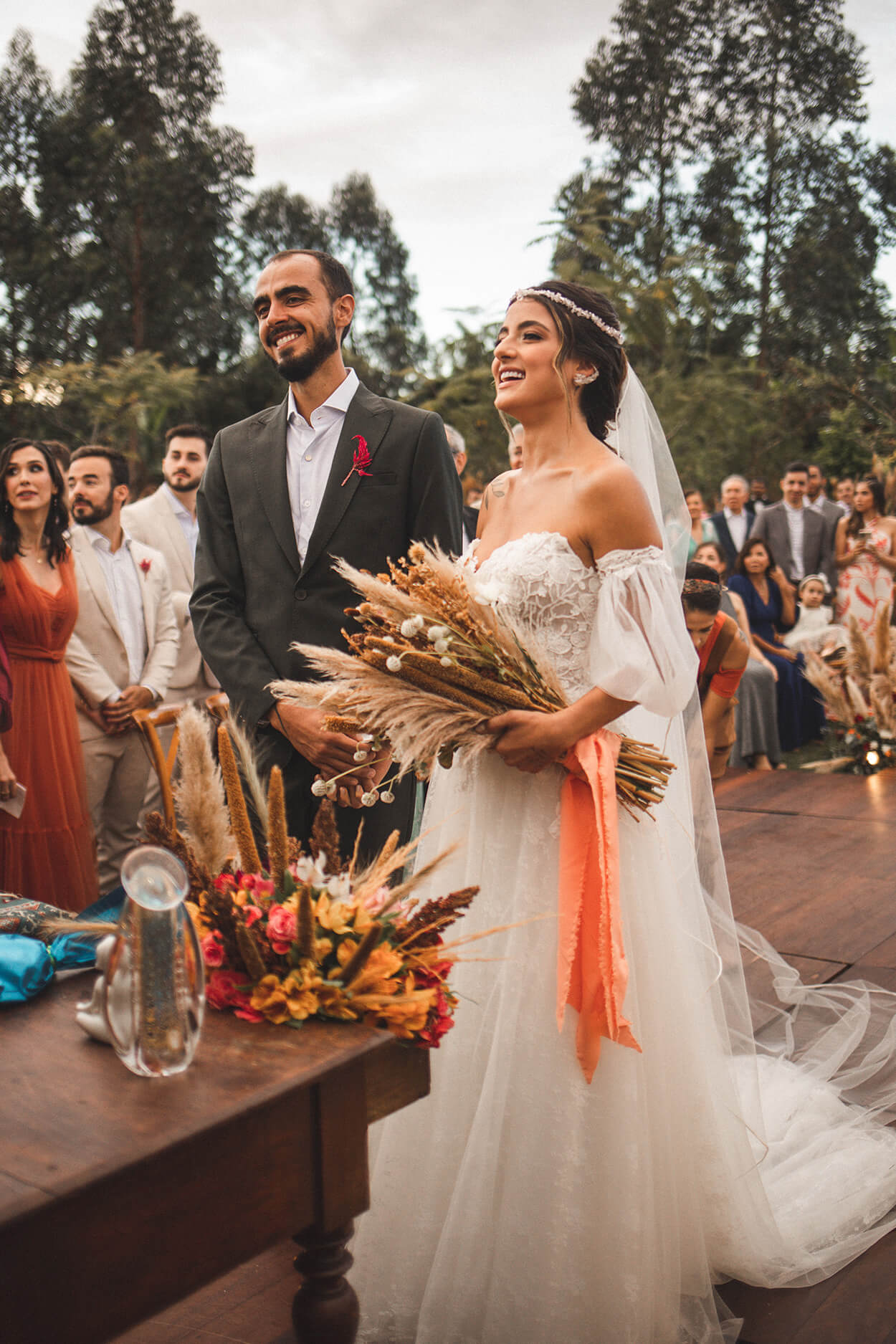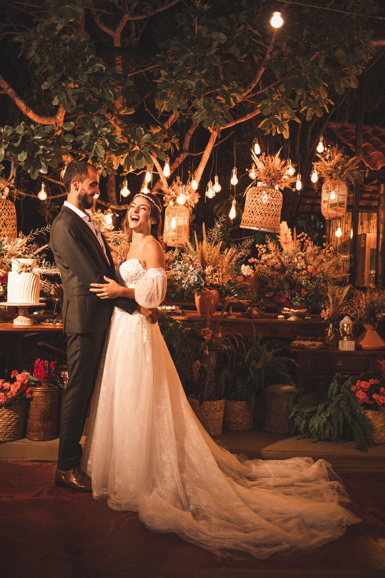 O casamento seguiu a filosofia de vida do casal. Ambos são adeptos do yoga, veganismo e das práticas naturais. Por isso, a decoração seguiu tons terrosos e inspirados nas cores do cerrado.