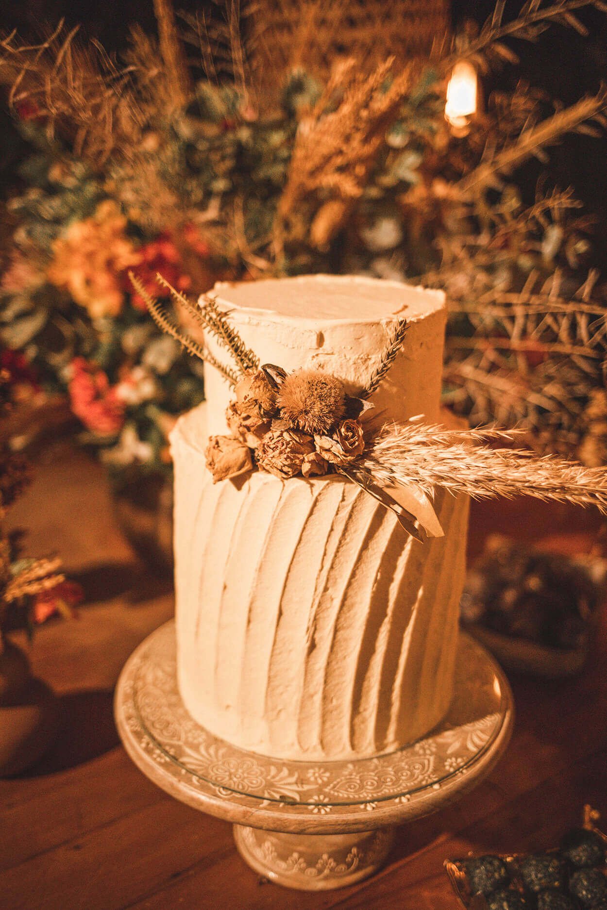 Mesa com flor e bolo de casamentp
