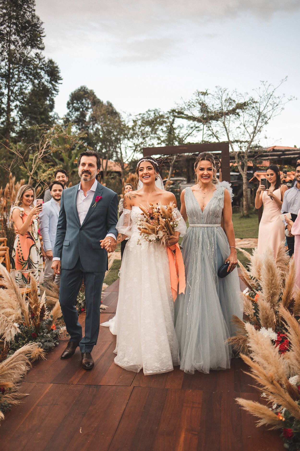 Noiva e os pais perto de placa de madeira