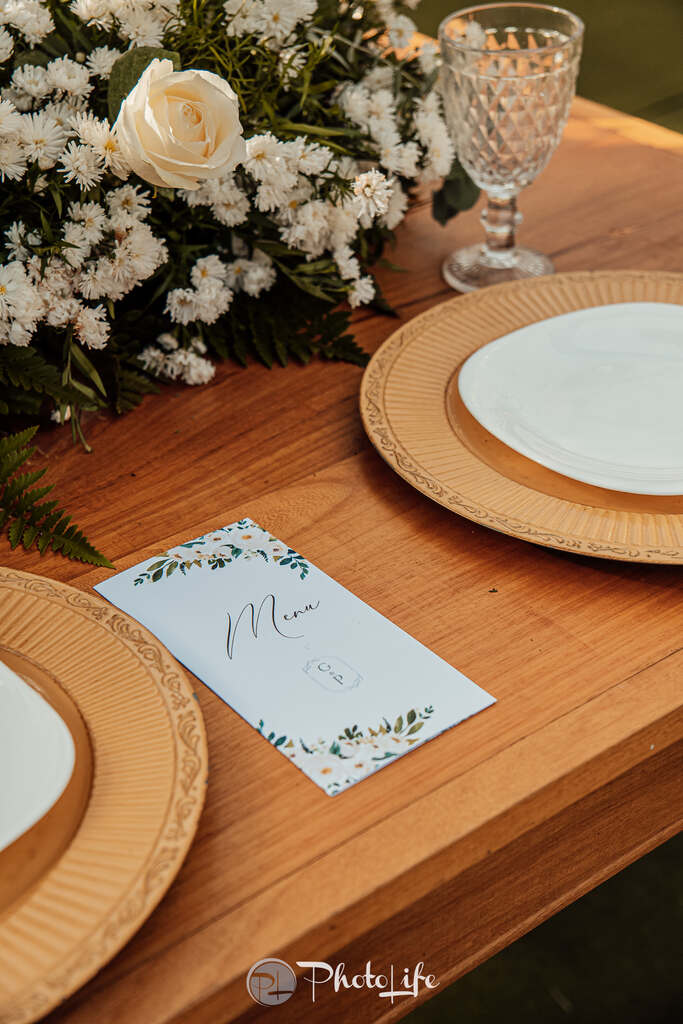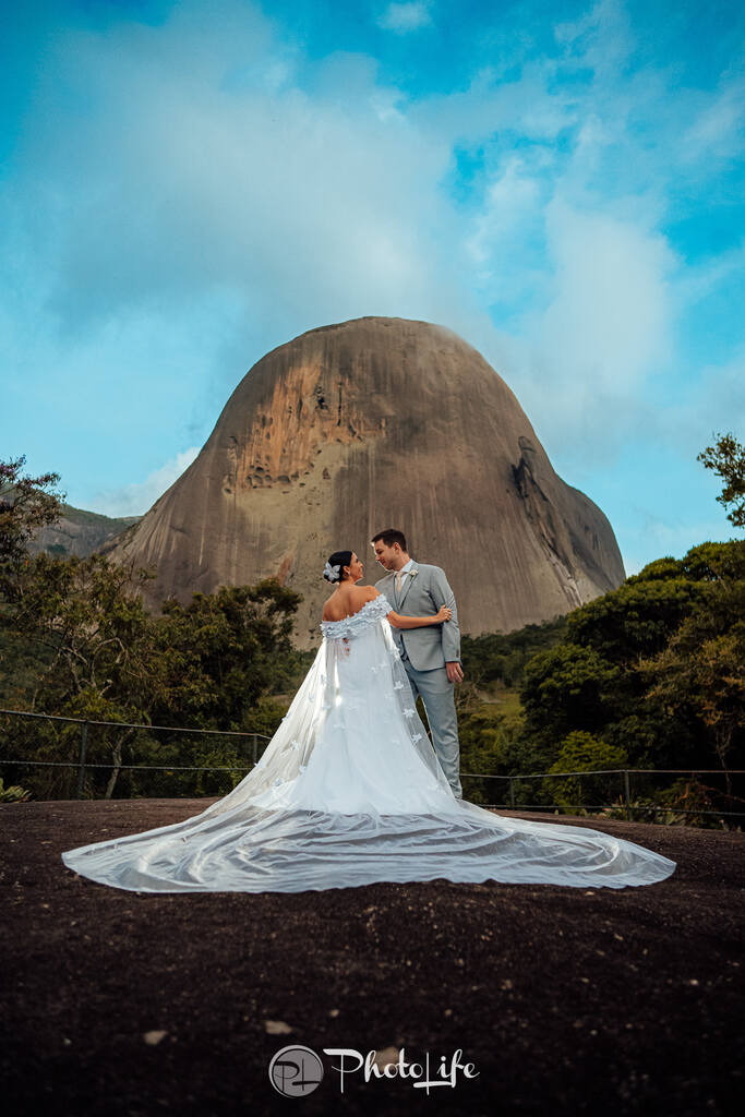 Os dois decidiram se casar em um lugar que tem muito significado para eles: Pedra Azul, no Espírito Santo. “Queria uma paleta verde e branca, com móveis de madeira. Não queria muita cor pois acreditei que o colorido do céu no pôr do sol faria todo o resto. Com a aquarela do campo, não precisava de muito para deixar o cenário de tirar o fôlego.