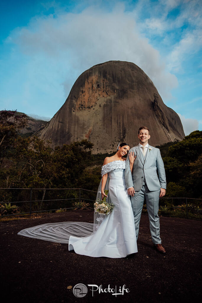 Os dois decidiram se casar em um lugar que tem muito significado para eles: Pedra Azul, no Espírito Santo. “Queria uma paleta verde e branca, com móveis de madeira. Não queria muita cor pois acreditei que o colorido do céu no pôr do sol faria todo o resto. Com a aquarela do campo, não precisava de muito para deixar o cenário de tirar o fôlego.