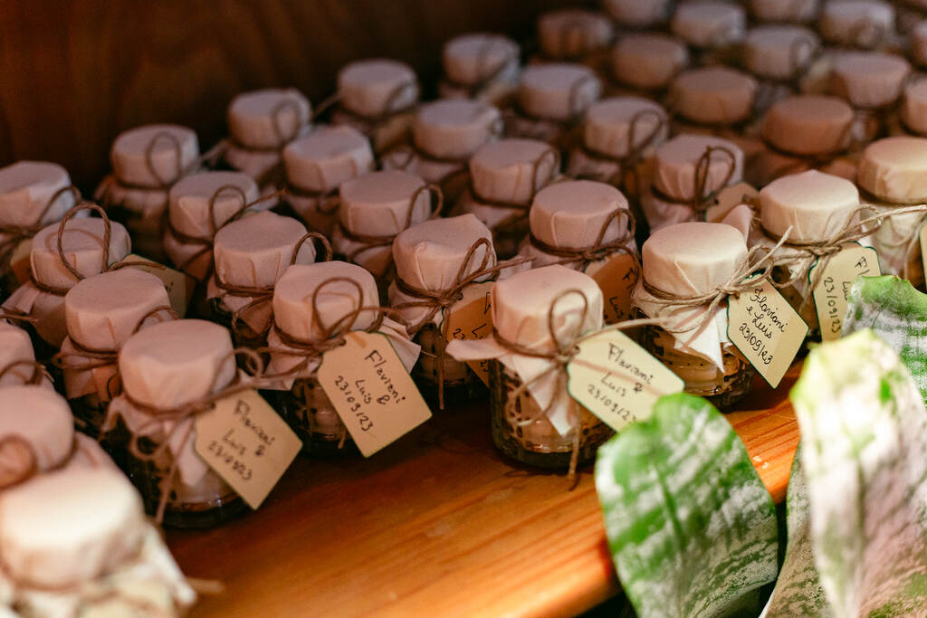 Para falar a verdade, o convite dos padrinhos merece um tópico à parte. O casal presenteou cada um deles com uma ecobag decorada com macramê e recheada de mimos: