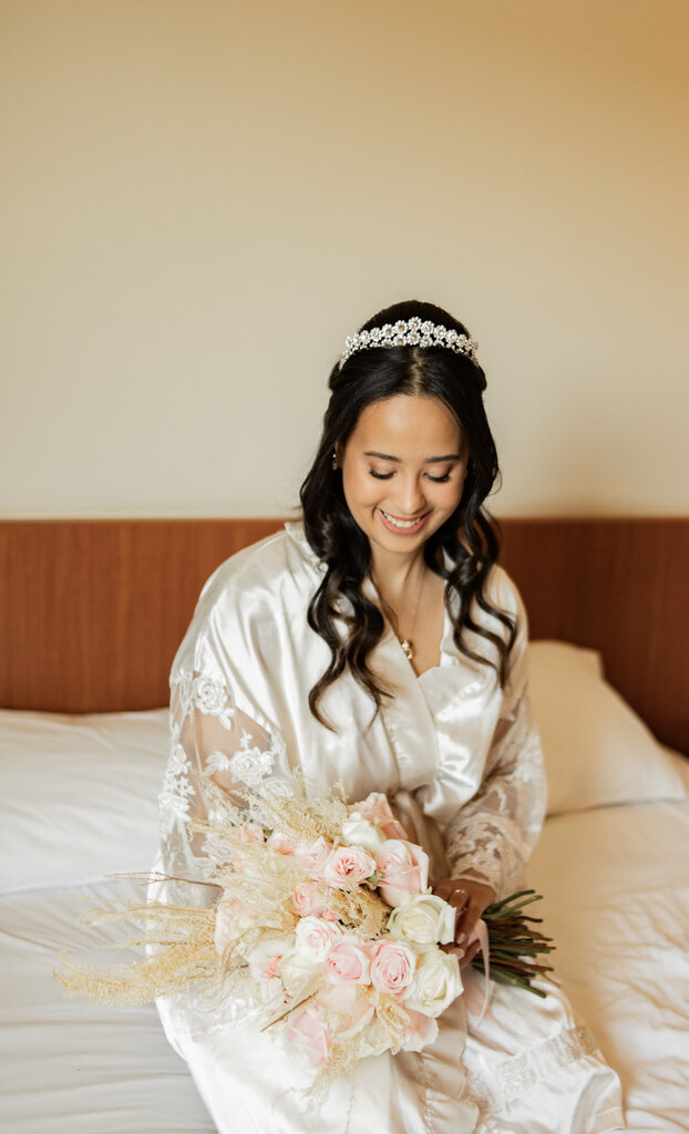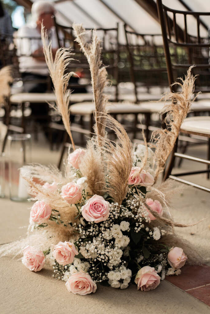 O nosso casamento seguiu a proposta boho chic, com uma paleta pensada a partir do dusty rose, muito rosa claro e capim dos pampas.”
