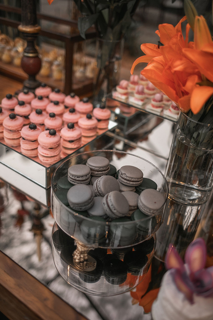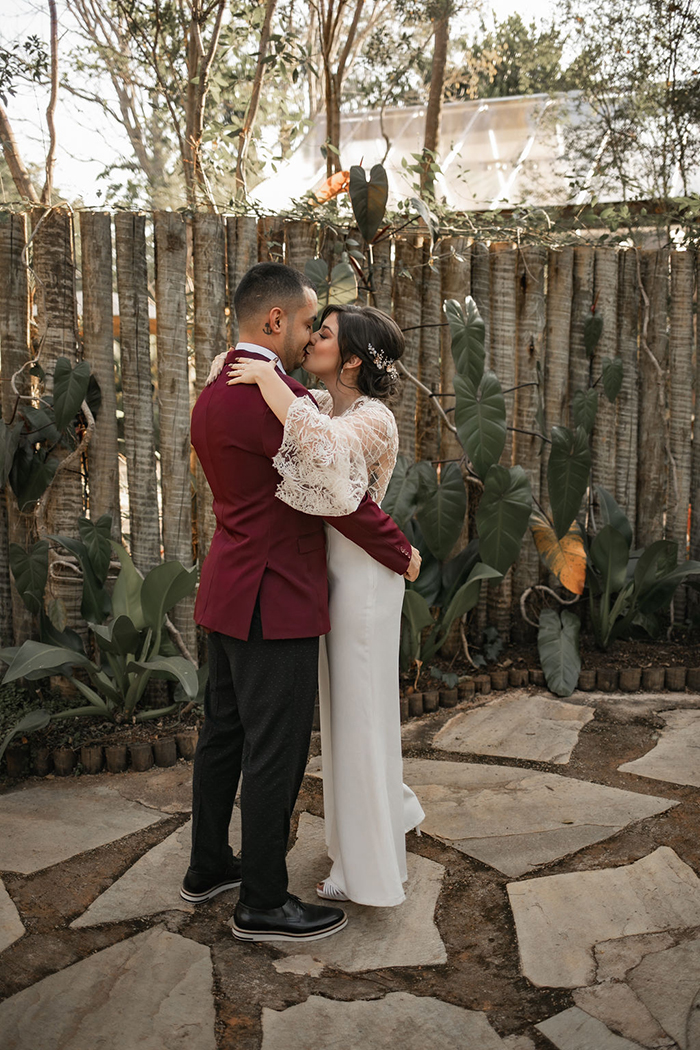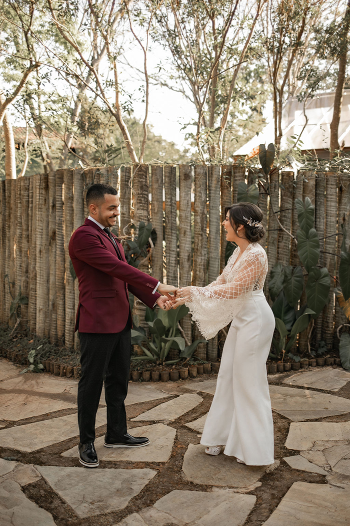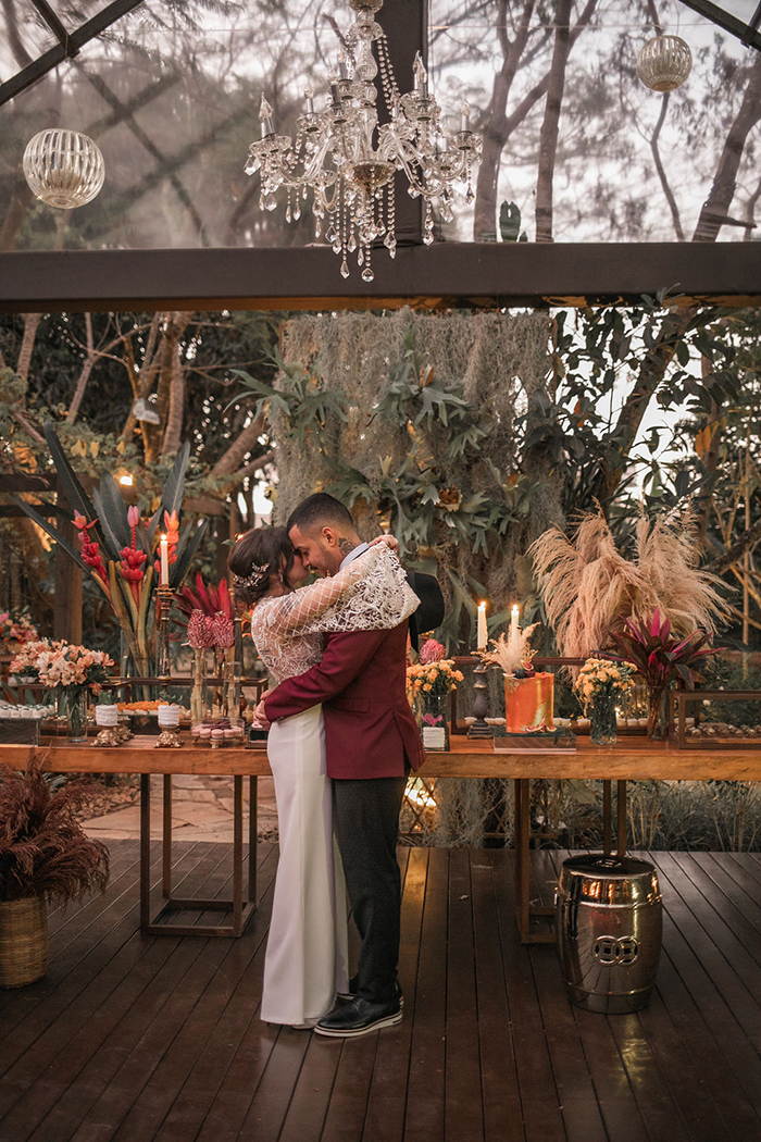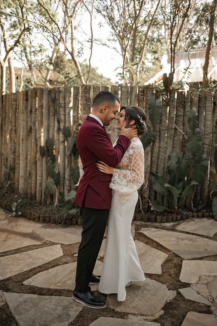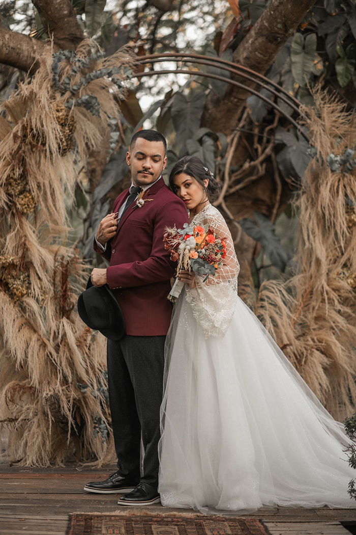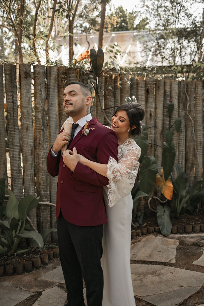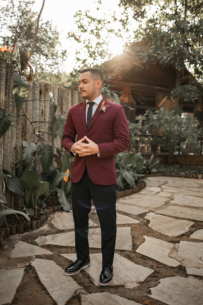 Já no noivo, trabalharam com peças diferentes e fora do padrão, com calça preta com poá e blazer marsala. E o sapato em estilo mais jovial.