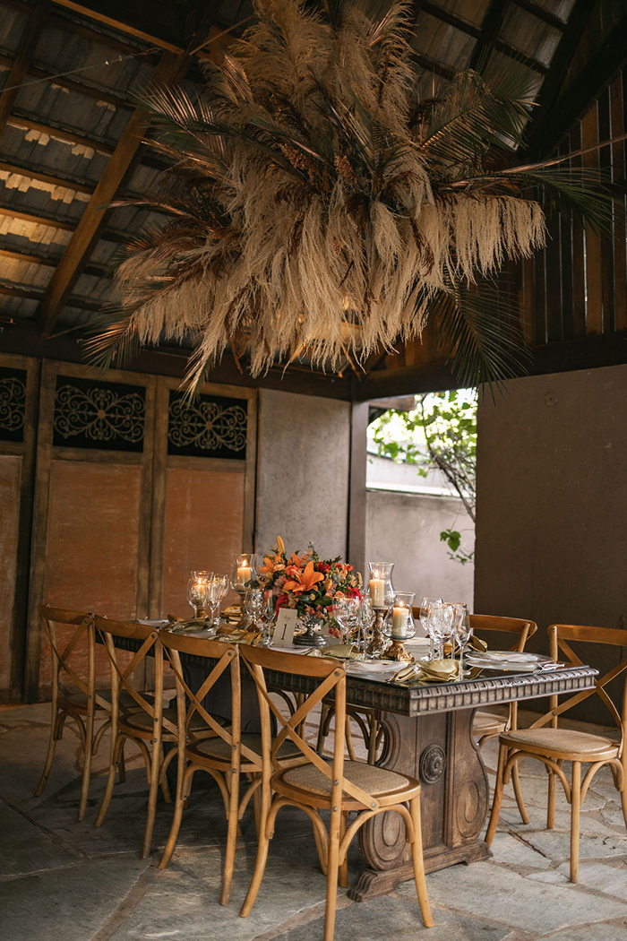Estilo bohemian, trabalhando muitas folhagens e capins secos, e tons pastéis contrastando com tons fortes como marsala e verde, e também trabalhando o Golden Hour, o sol do fim da tarde. O local tem um aspecto rústico chic, que evidencia ainda mais o estilo proposto para o editorial, e que contou com a colaboração dos móveis mais conceituais e originais de Brasília.