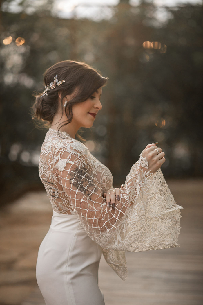 O vestido foi criado pensando no conceito do editorial além do óbvio. Como muitas noivas pensam no clássico vestido, criaram um 2 em 1 com um macacão que surpreendeu ao tirar a saia dando a possibilidade da noiva inovar com o macacão mas sem fugir do conceito noiva. “Amamos fazer criações personalizadas com o estilo na noiva que chega no nosso ateliê.”