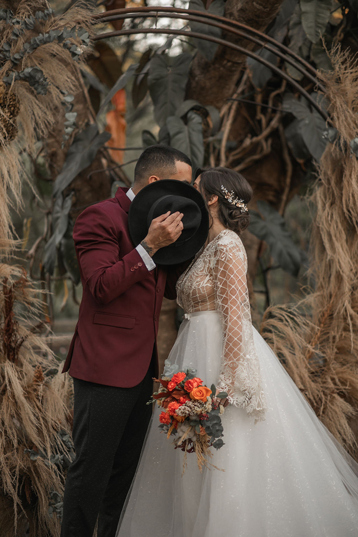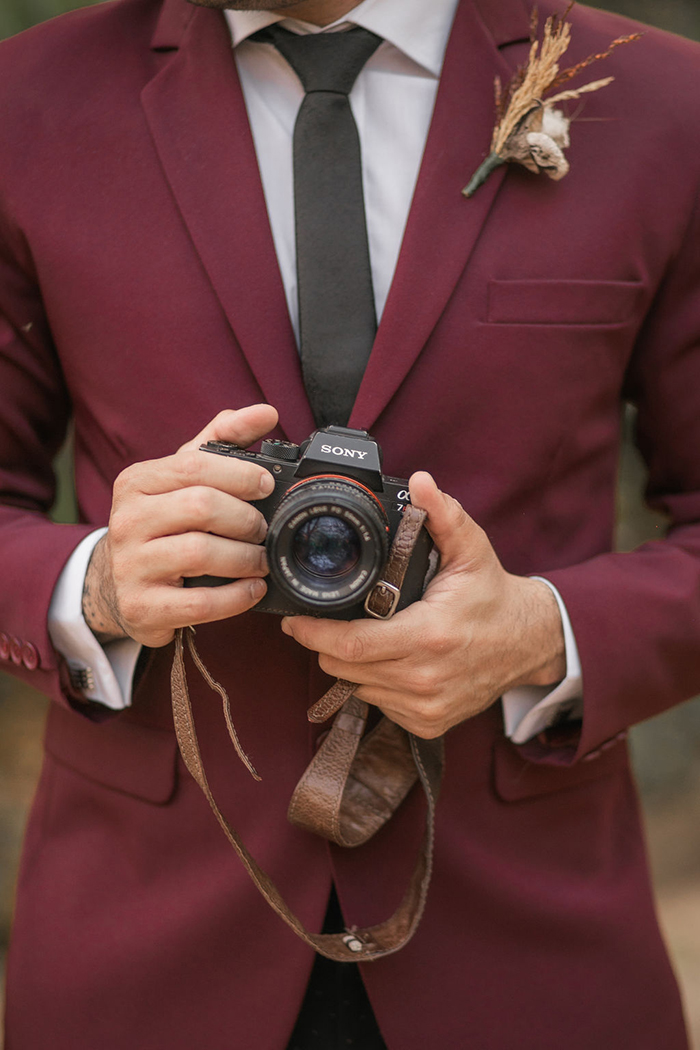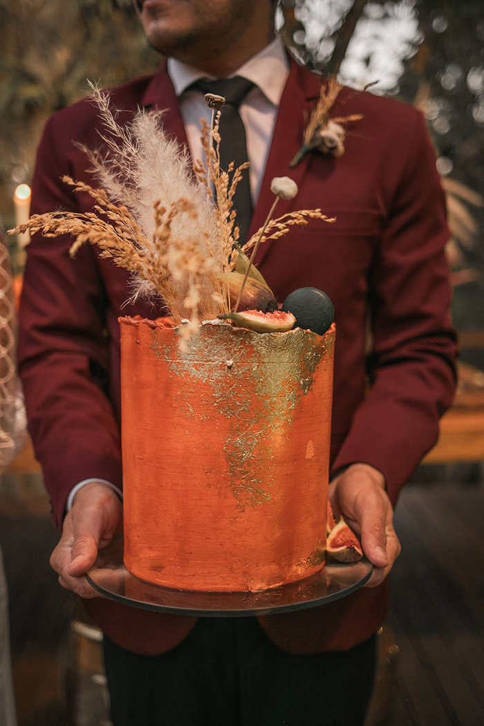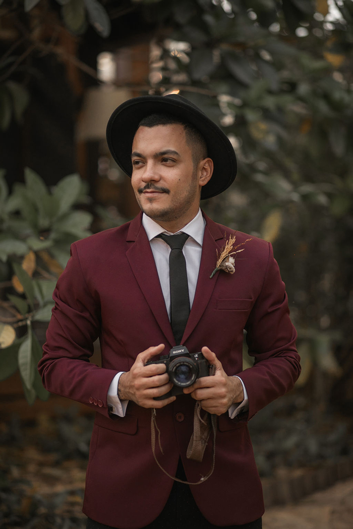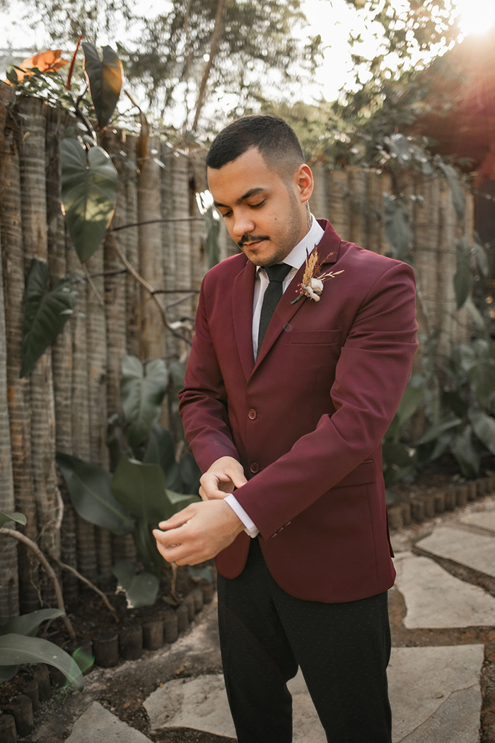 Já no noivo, trabalharam com peças diferentes e fora do padrão, com calça preta com poá e blazer marsala. E o sapato em estilo mais jovial.