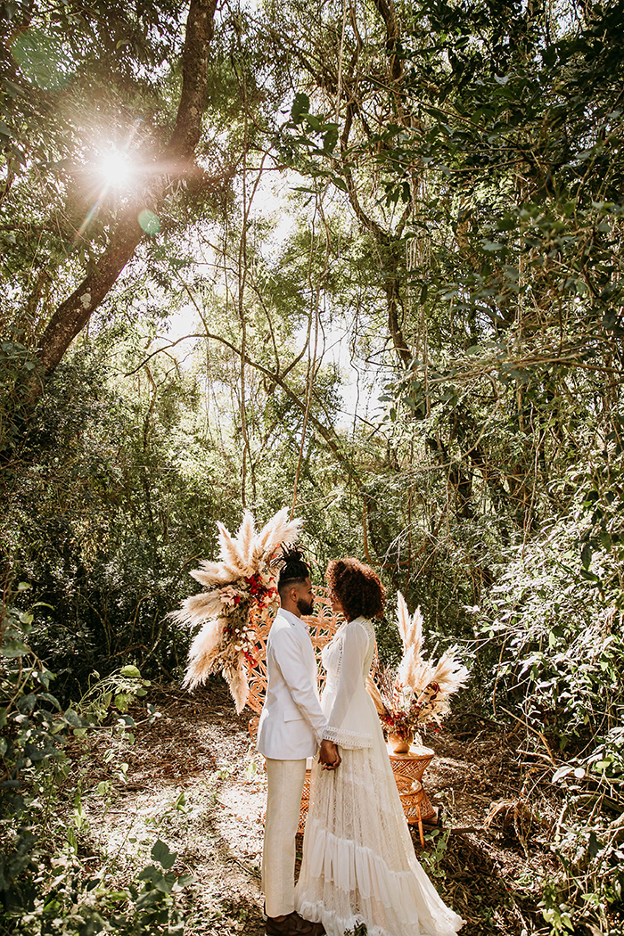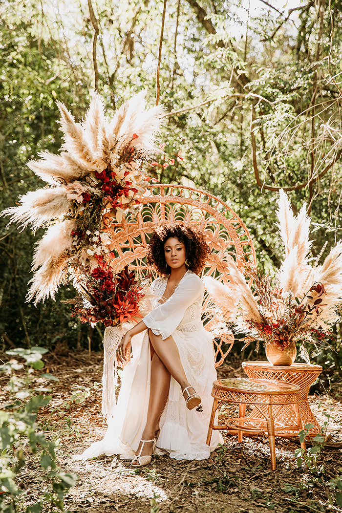 Este não é um editorial focado na pandemia e o casamento, seu propósito é levantar outras questões e um lifestyle que está cada vez mais presente na vida diária das pessoas, um movimento de mudança mesmo. A ideia do Boho Soul foi trazer um clima boho com tons terrosos, flores e folhagens secas e outros ícones de decoração, além de levantar questões de sustentabilidade e representatividade no universo do casamento.