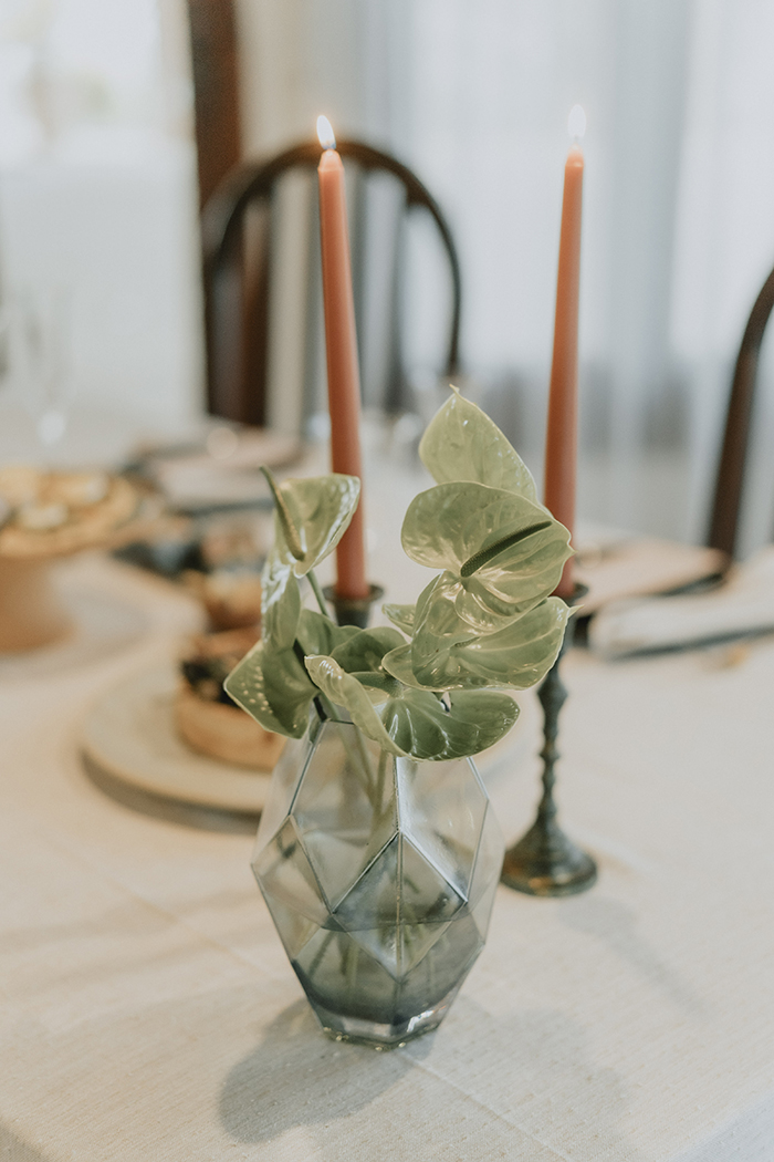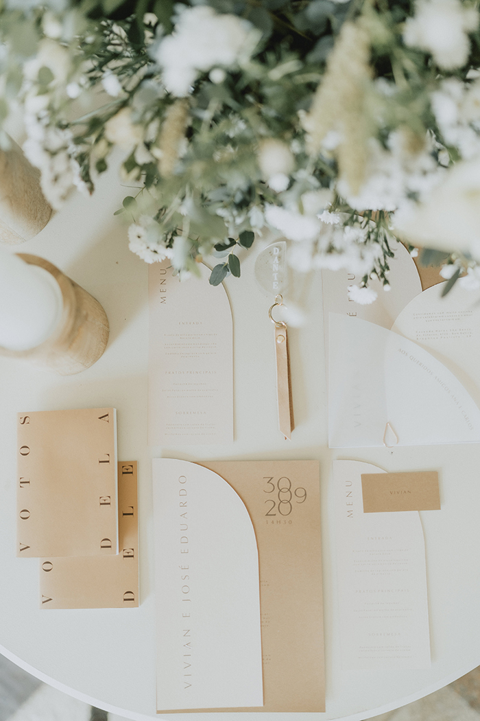 Para a decoração, o conceito pensando pela Flow Decor foi transparecer todo aconchego de celebrar em casa mas de forma elegante e romântica, explorando uma estética com influência Hygge mas também minimalista. A escolha de tons claros, flores clássicas misturadas com bastante textura, peças em cerâmica, uso de flores secas, tudo para um resultado bem único para compor cenários simples porém surpreendentes. Esse mesmo conceito foi seguido pelo Estúdio Pinus, que criou uma papelaria minimalista e elegante
