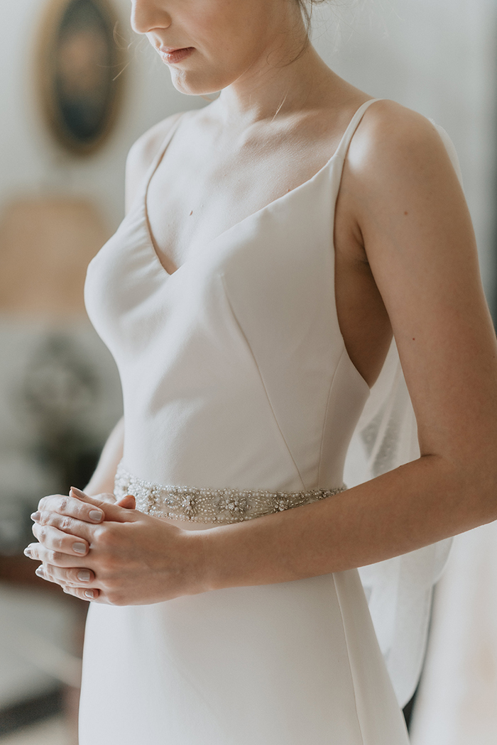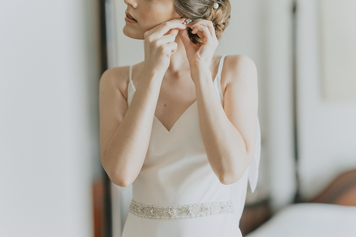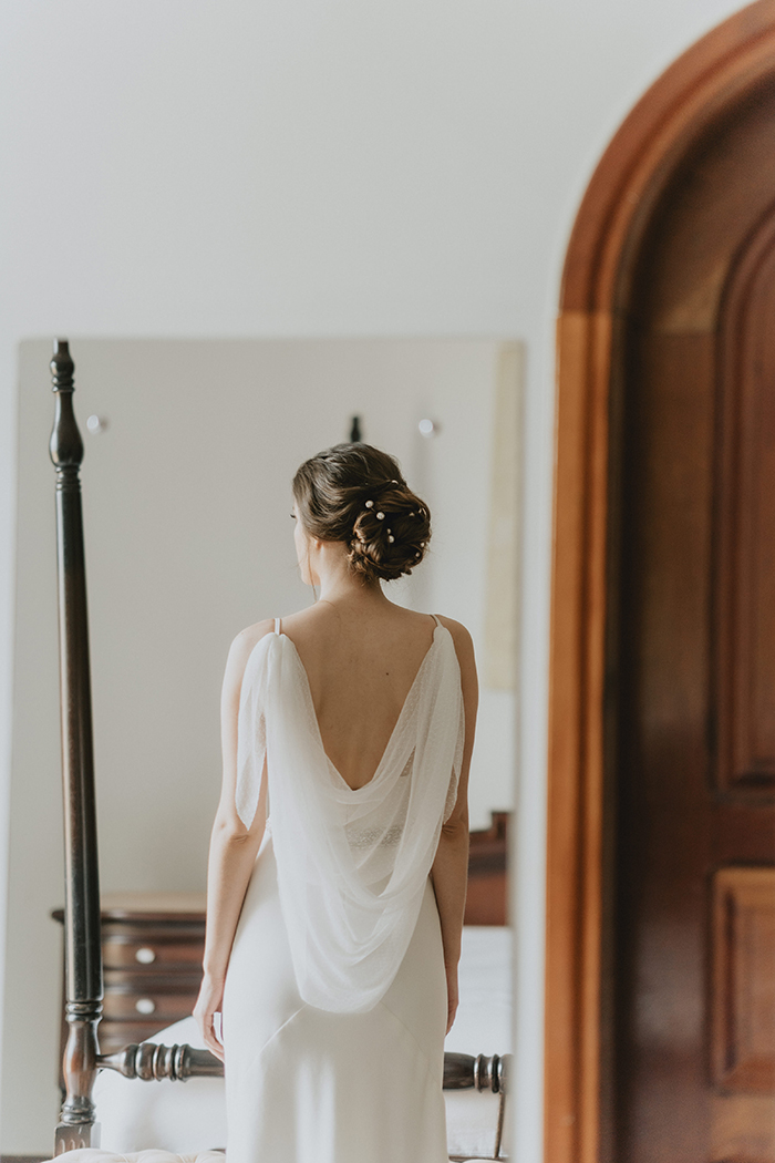 O vestido da Vivian, minimalista e chic, foi complementado pela Gisele Barbosa com um chignon baixo decorado com pérolas gigantes (amamos!) e uma beleza iluminada e clean.