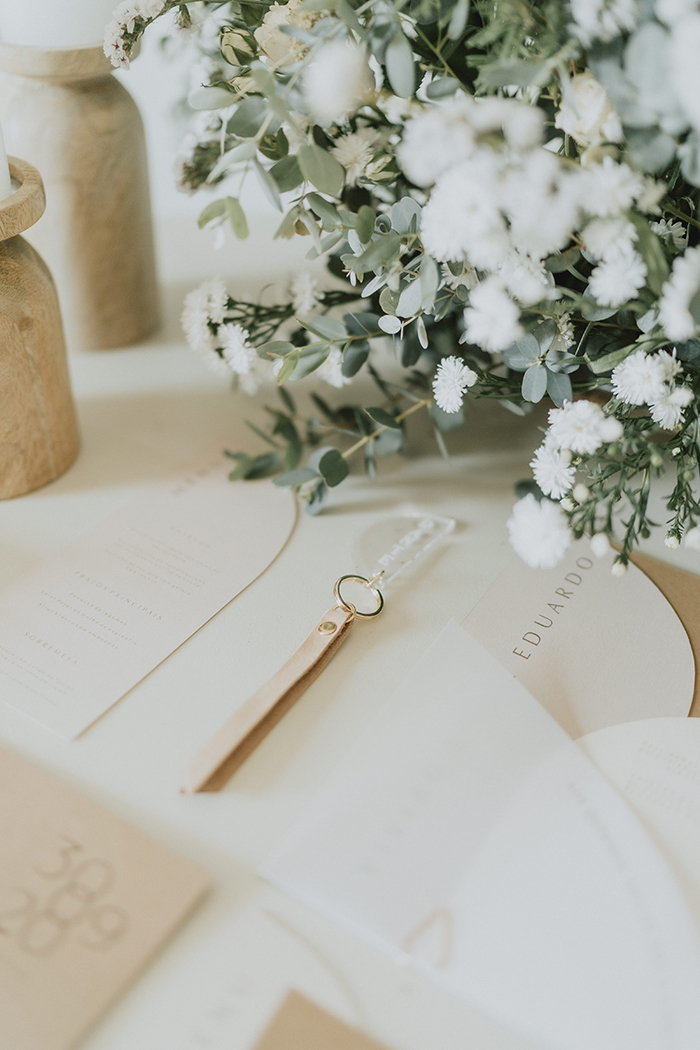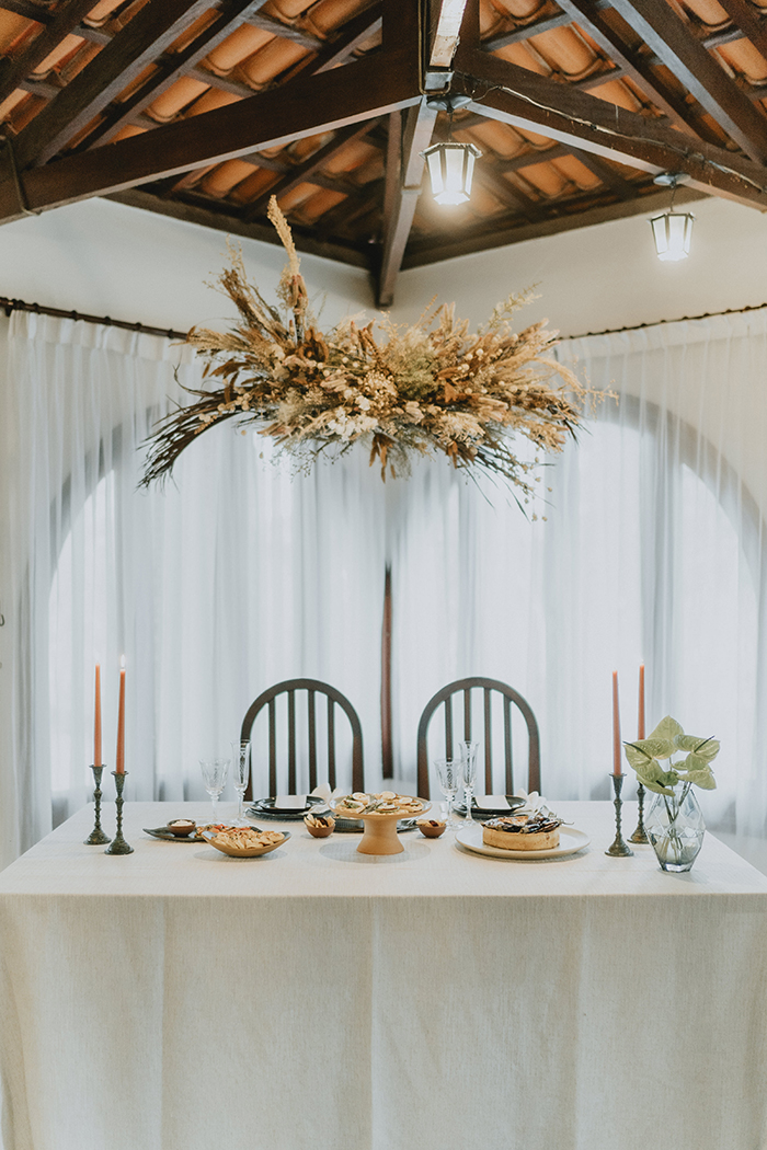 Para a decoração, o conceito pensando pela Flow Decor foi transparecer todo aconchego de celebrar em casa mas de forma elegante e romântica, explorando uma estética com influência Hygge mas também minimalista. A escolha de tons claros, flores clássicas misturadas com bastante textura, peças em cerâmica, uso de flores secas, tudo para um resultado bem único para compor cenários simples porém surpreendentes. Esse mesmo conceito foi seguido pelo Estúdio Pinus, que criou uma papelaria minimalista e elegante