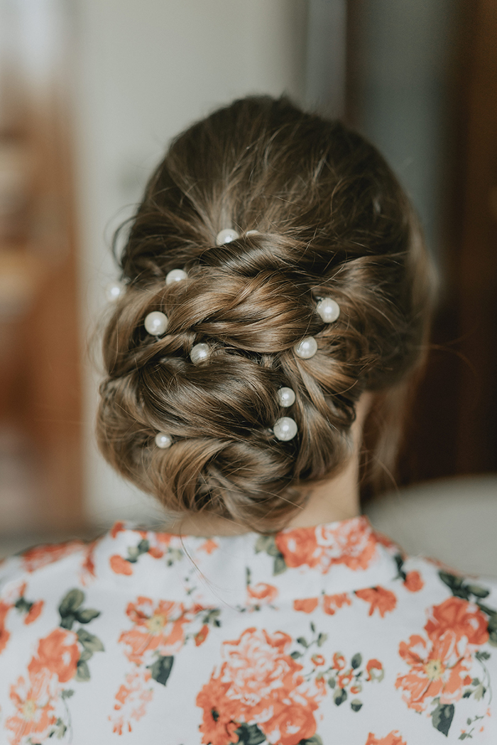 O vestido da Vivian, minimalista e chic, foi complementado pela Gisele Barbosa com um chignon baixo decorado com pérolas gigantes (amamos!) e uma beleza iluminada e clean.