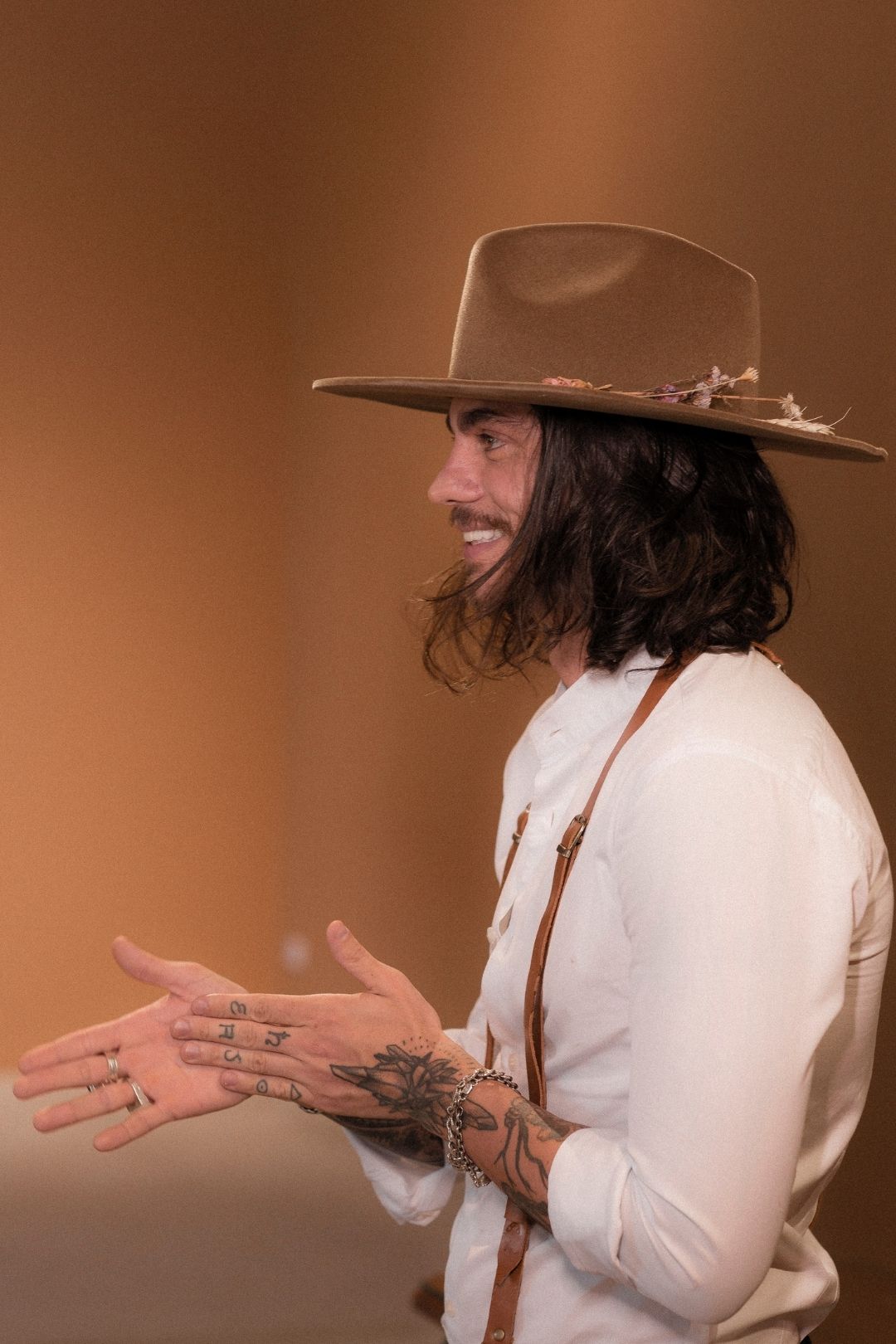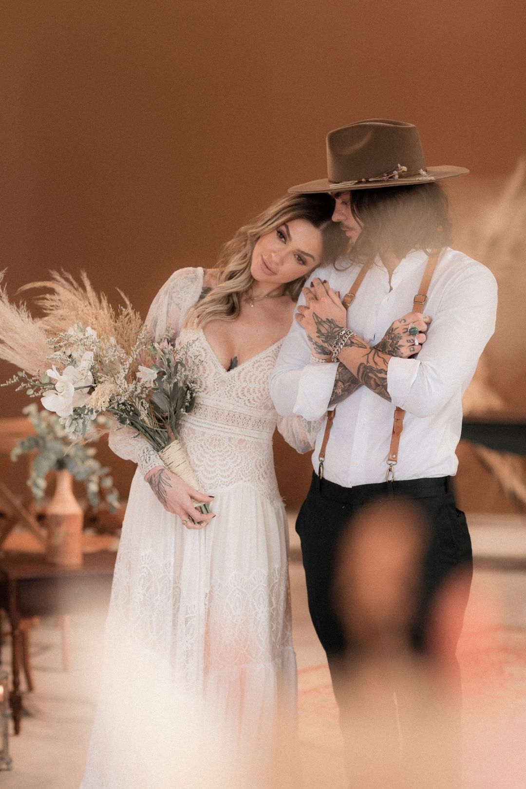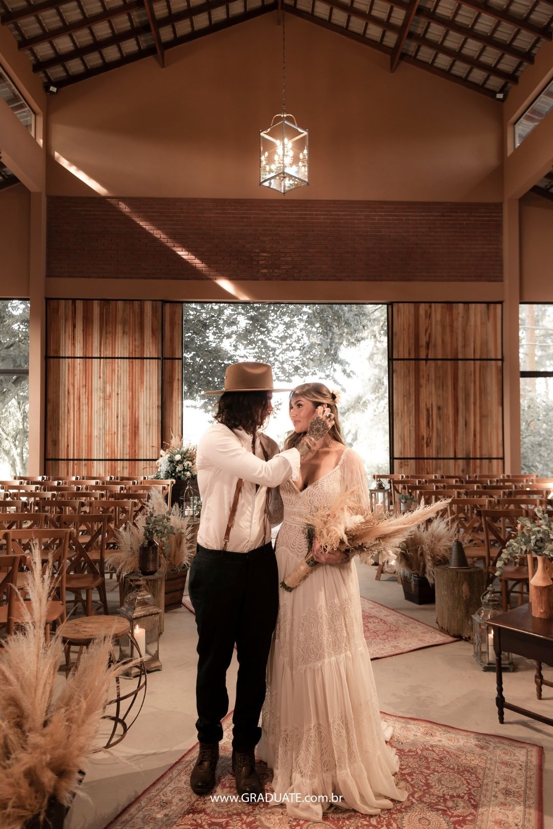 O noivo esbanjou charme com um look que fugiu totalmente do tradicional. “Apostamos em um noivo sem paletó, camisa aberta, suspensório, botas e é claro, um chapéu”.