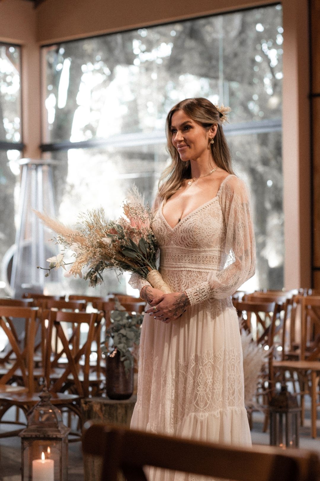 – Decoração com elementos rústicos, velas, letreiro neon, flores e folhagens secas;
