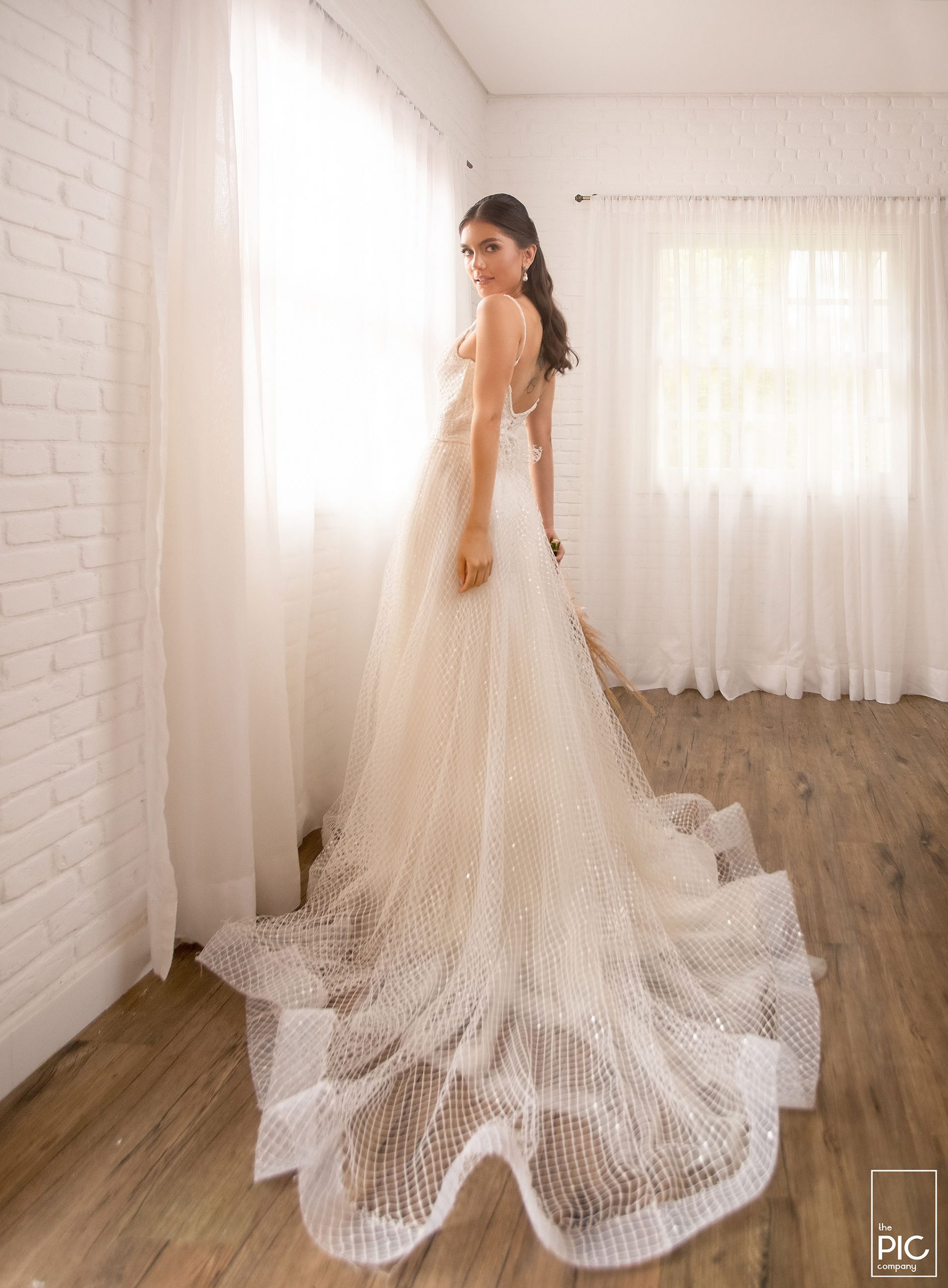 O vestido longo tem corte romântico tradicional, com alcinha e leve brilho, mas ganhou muita modernidade e diferenciação com a utilização de novas texturas.