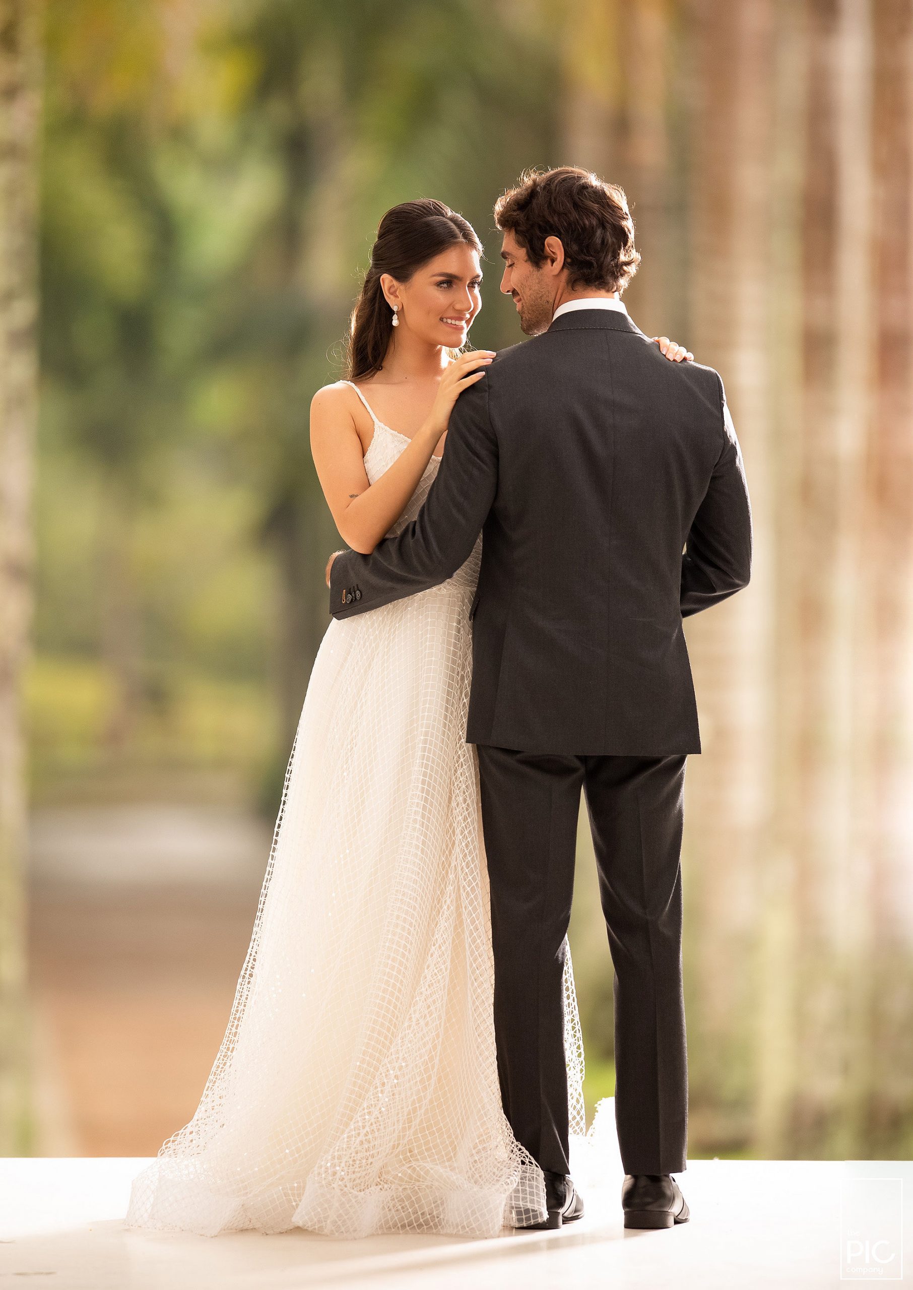 O look para mini wedding do noivo contou com uma calça de linho belga e camisa de algodão 120 fios, que trouxe extrema elegância a um look aparentemente mais casual.