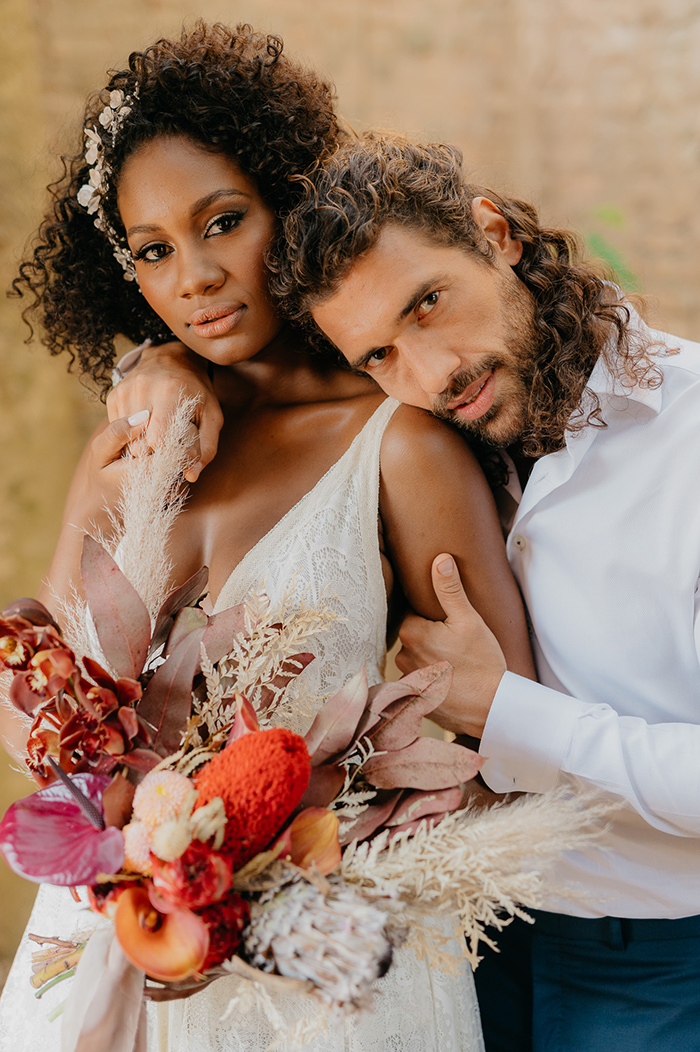 A noiva usou dois vestidos, um para cerimônia e outro para a festa, ambos da Casamarela Yolan Cris. Franjas, leveza e sofisticação foram fundamentais na criação do conceito. Os acessórios, penteado e maquiagem realçaram a beleza da mulher negra, seus cabelos lindos e olhar penetrante.
