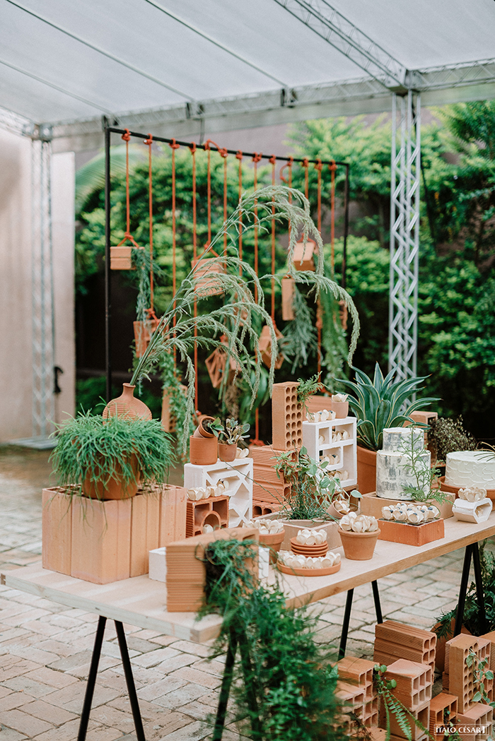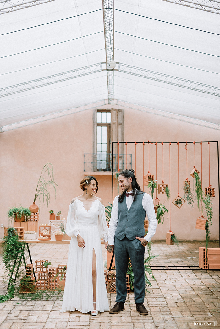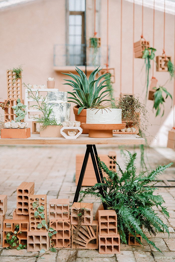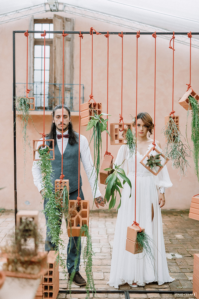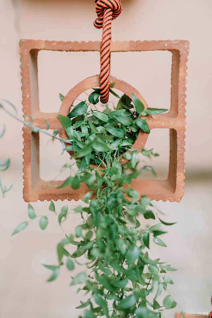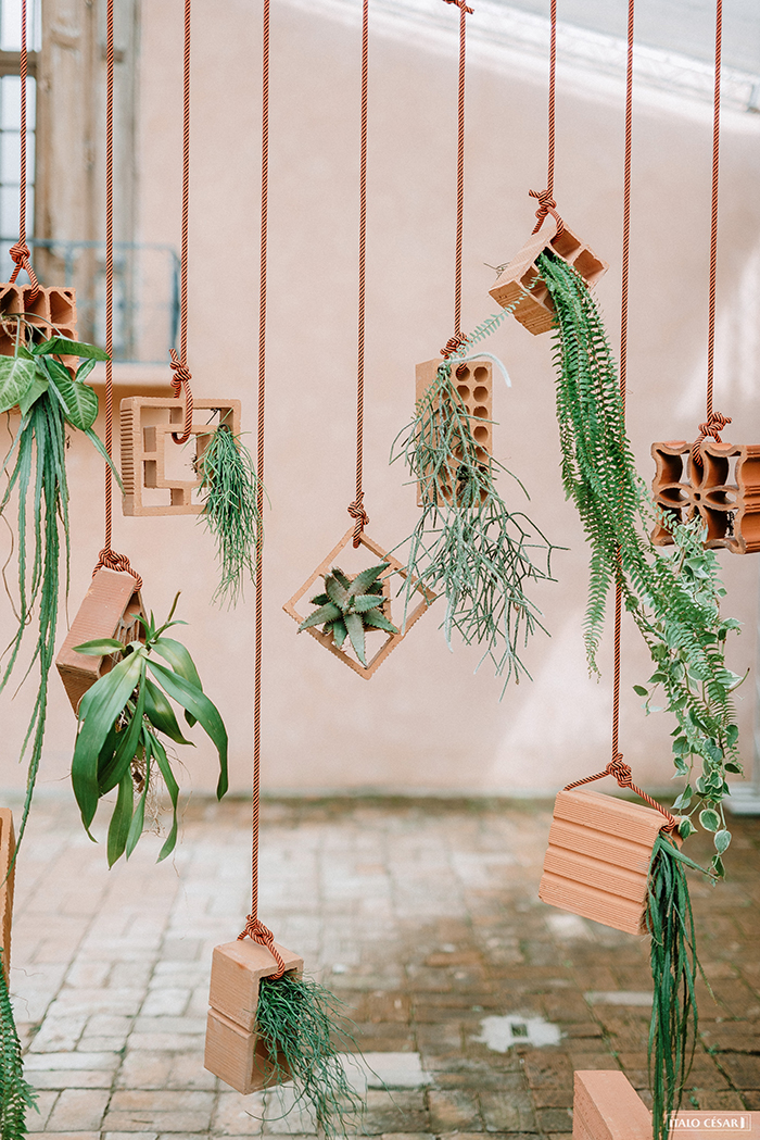 Trazendo essa ideia cinematográfica para o casamento incluiu-se folhagens nos tijolos com suas raízes, algo bem orgânico. Ao inserir plantas nos tijolos também faz-se a referência de vida que brota dos tijolos juntos, é presença que nasce da união de todos os elementos.