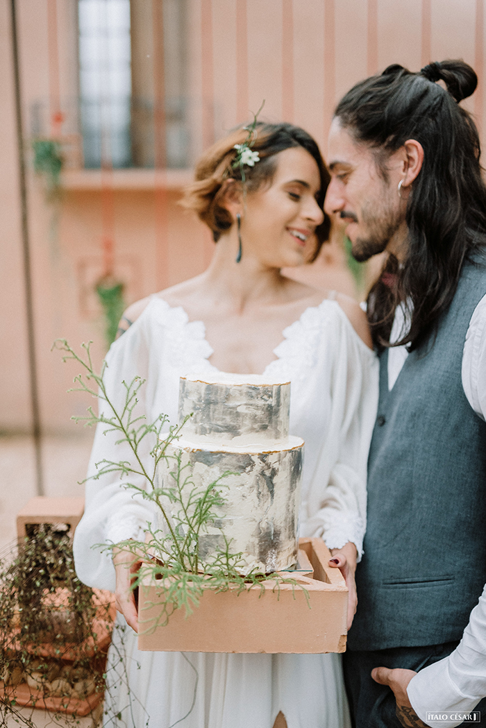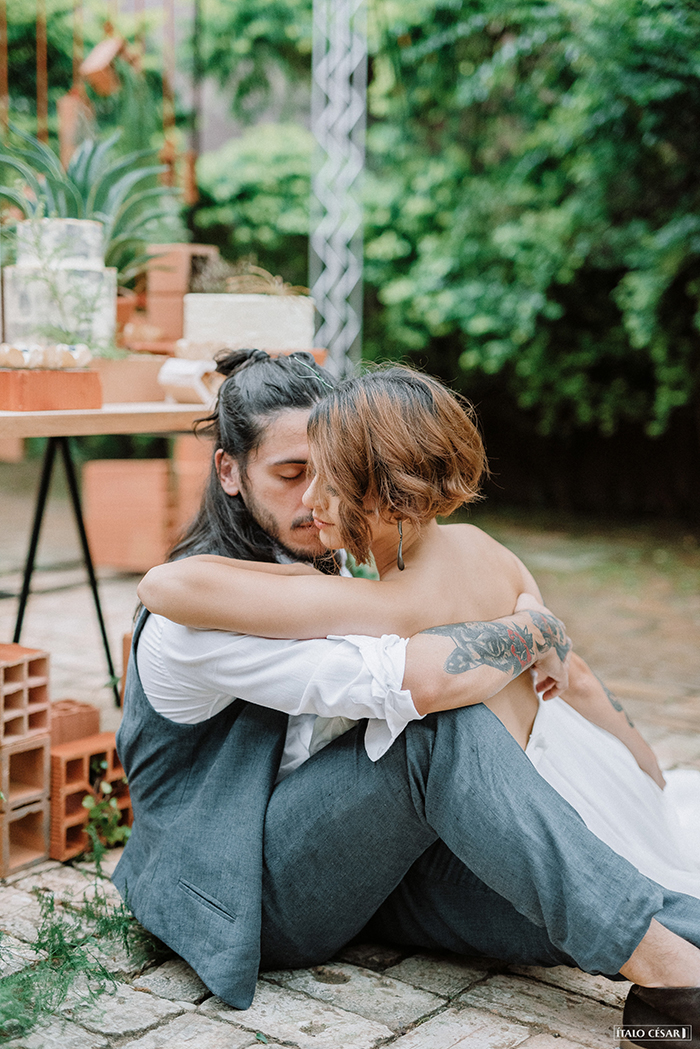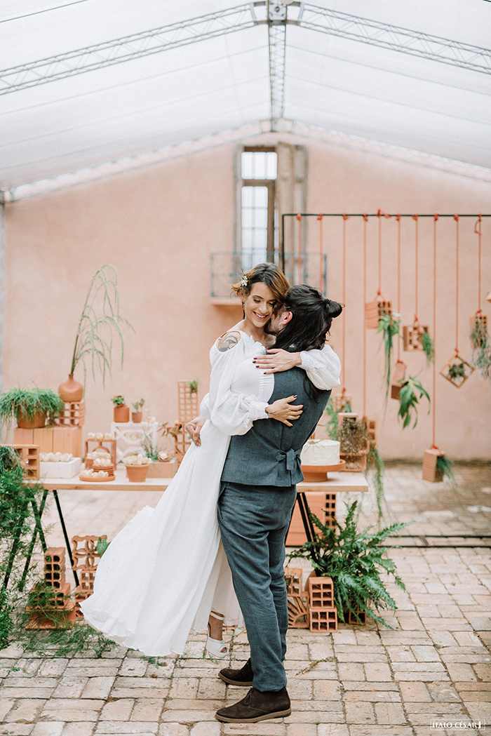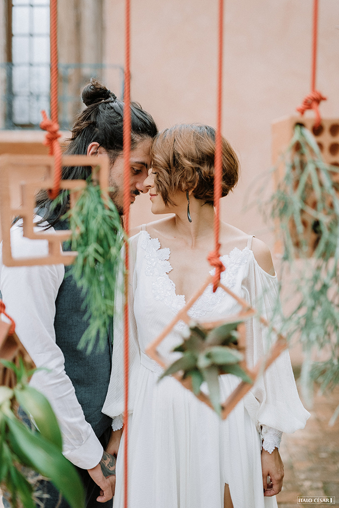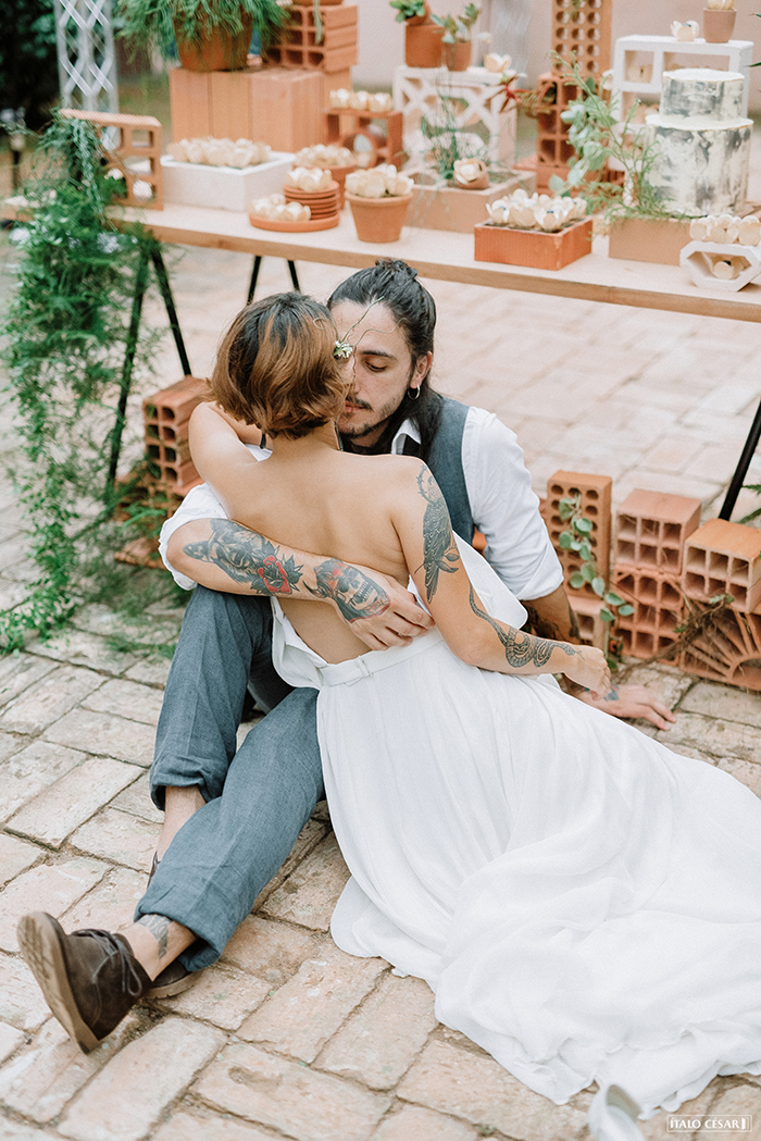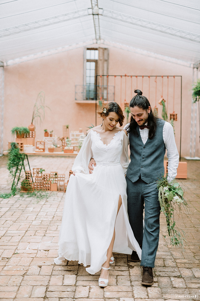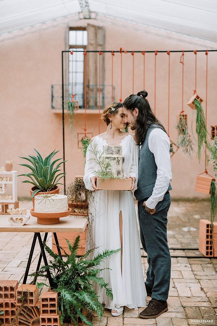 Trazendo essa ideia cinematográfica para o casamento incluiu-se folhagens nos tijolos com suas raízes, algo bem orgânico. Ao inserir plantas nos tijolos também faz-se a referência de vida que brota dos tijolos juntos, é presença que nasce da união de todos os elementos.