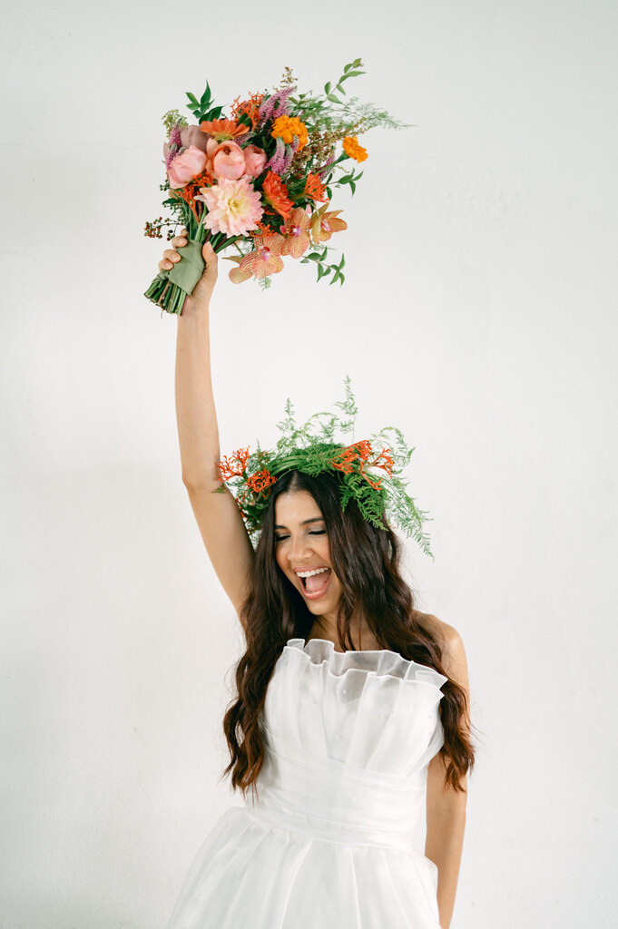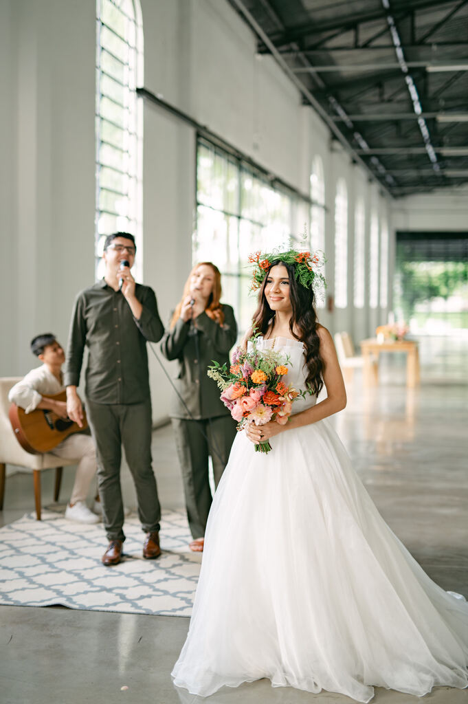 Agatha encantou com um vestido romântico com linhas modernas e muita fluidez. Para complementar o visual de “jardim encantado”, uma headpiece de flores naturais.