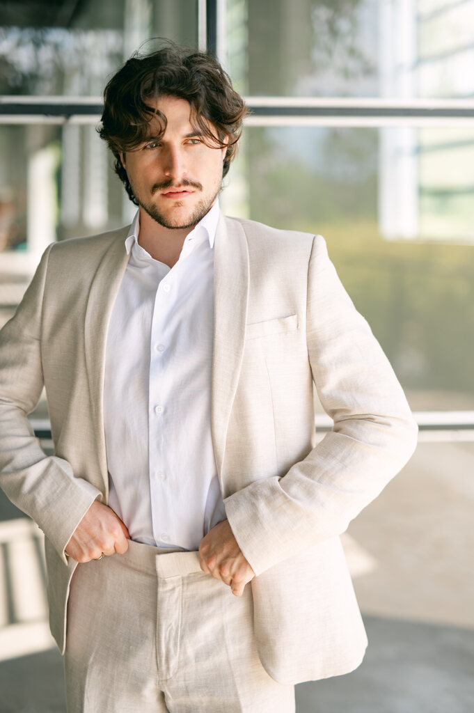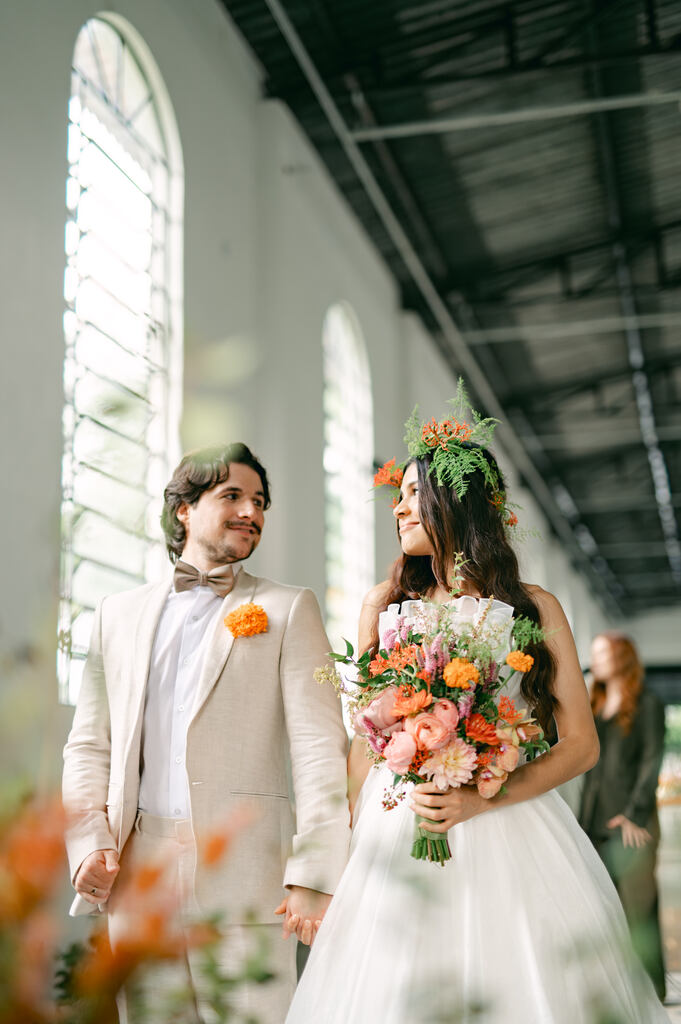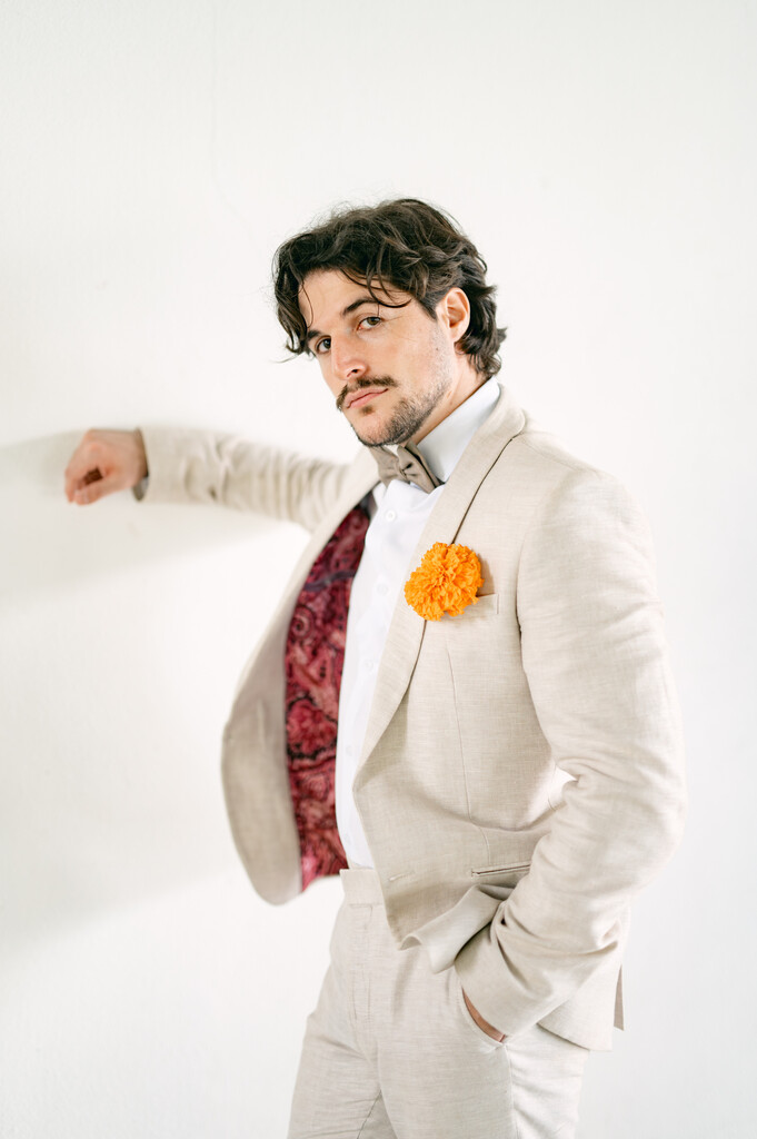 E para seguir o estilo clean, o noivo usou um traje em linho que foi finalizado com um cravo laranja.