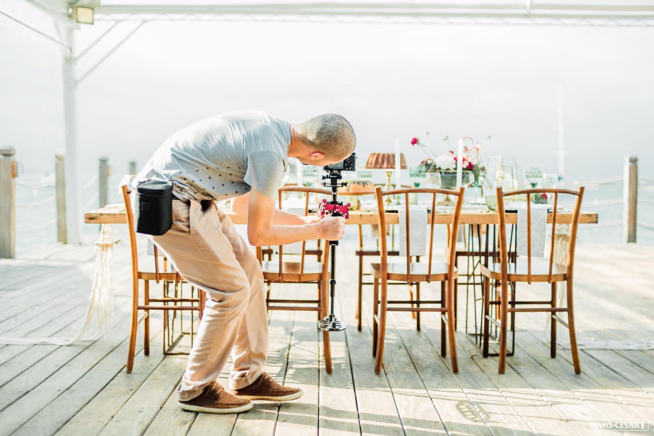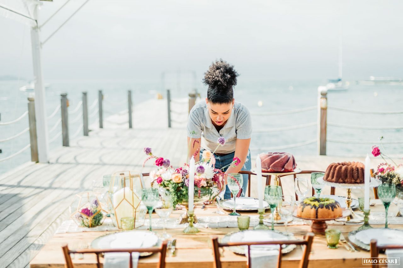 Eu amo praia, e pensei que poderíamos fazer algo nesse cenário. No entanto, sempre que penso em um editorial nesse estilo me vem a cabeça noivos com o pé na areia ou algo do tipo que você encontra fácil na internet. Busquei referências em filmes, sites de fotógrafos gringos e visualizei um pier, onde não há nada além do mar como plano de fundo. Conversei com a Lari sobre a ideia e ela amou, até tentamos ver algo que fosse no meio do mar (como uma ilha mesmo), mas não encontramos nada e partimos para visitar o Pier 151 em Ilhabela.