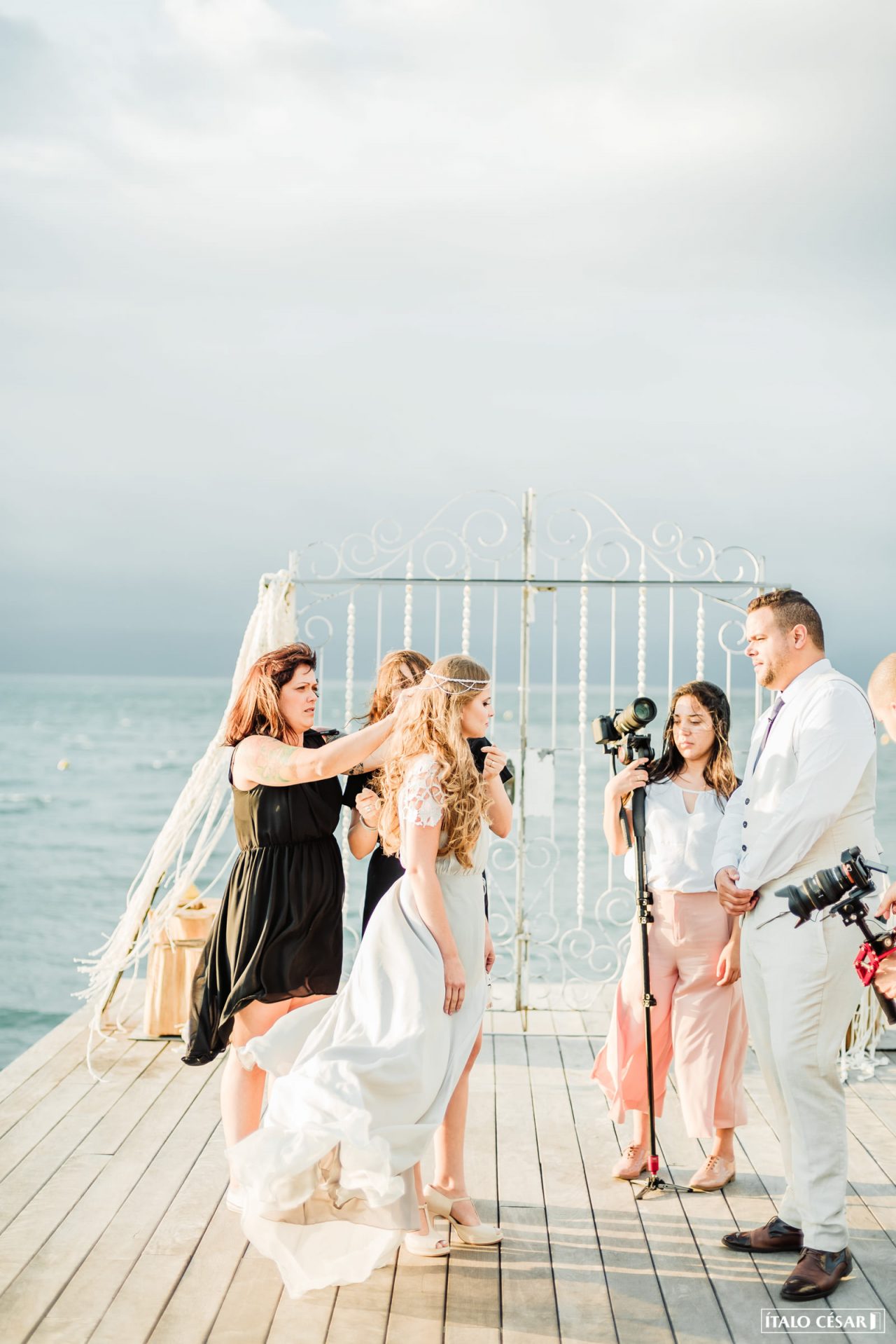 Uma das ultimas reuniões foi sobre a beleza da noiva. No ateliê da Julia Pak estávamos, eu, Julia, Larissa (Seraphine Eventos ), Bárbara (Atelier De Beaute), Jaque (For Jack) e online a Kell (Atelier Girardi). Pensando não em praia, mas oceano. A Julia desenhou o vestido e resolvemos usar um tom de cinza, e a roupa do noivo mais clara (praticamente inverter o comum – noivo escuro e noiva de branco). Como na praia geralmente tem muita ventania (vocês vão ver no vídeo), o vestido tinha que ser feito em um tecido que nos proporcionasse uma fotografia incrível com os movimentos. Depois, a Bárbara fechou tudo com a ideia de fazer a beleza dela inspirada em sereias, com um acessório de cabelo bem delicado e uma make que destacasse os olhos azuis da Débora.