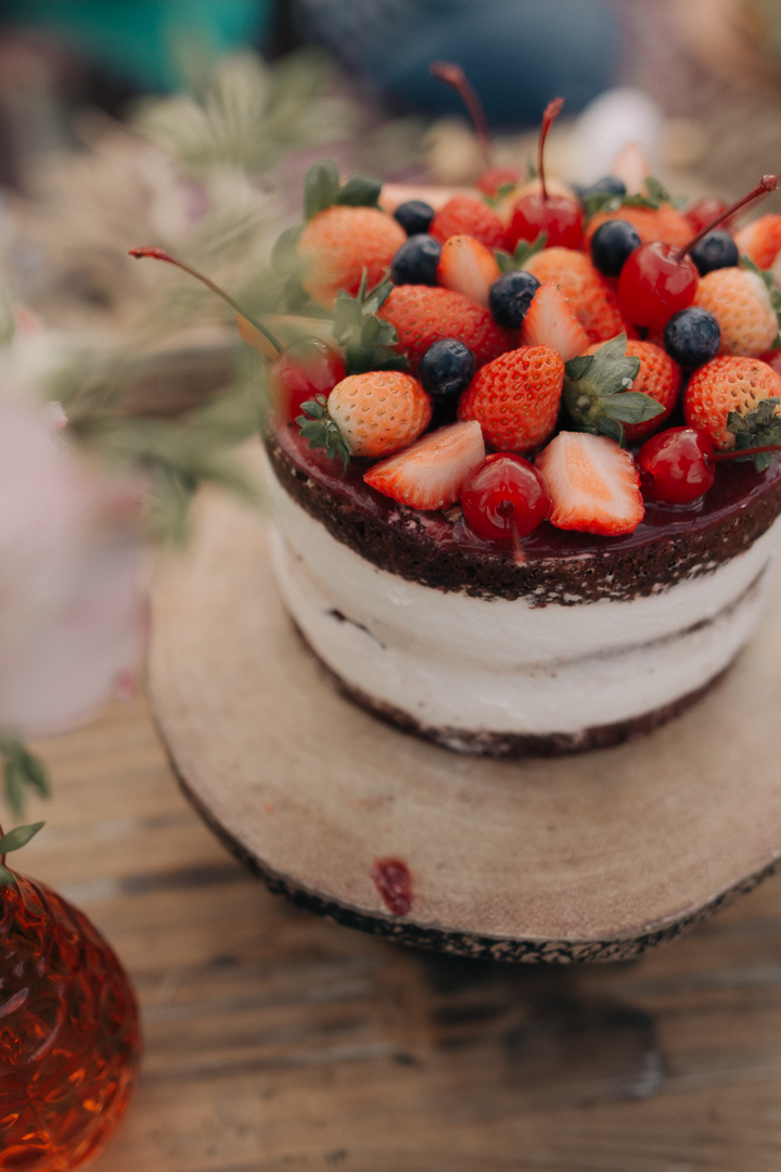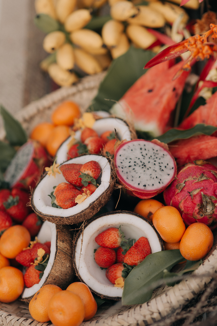 Foi criado um cardápio leve para combinar com o estilo de vida dos noivos e que pudesse ser degustado na praia. Mais do que servir o menu ao ar livre, queriam incorporar cores e frescor ao cenário de boas vibrações desta união. As frutas da estação tiveram um papel importante – elas estiveram presentes nas bebidas, numa peneira no melhor estilo “charming & chic” e em diversas preparações servidas.